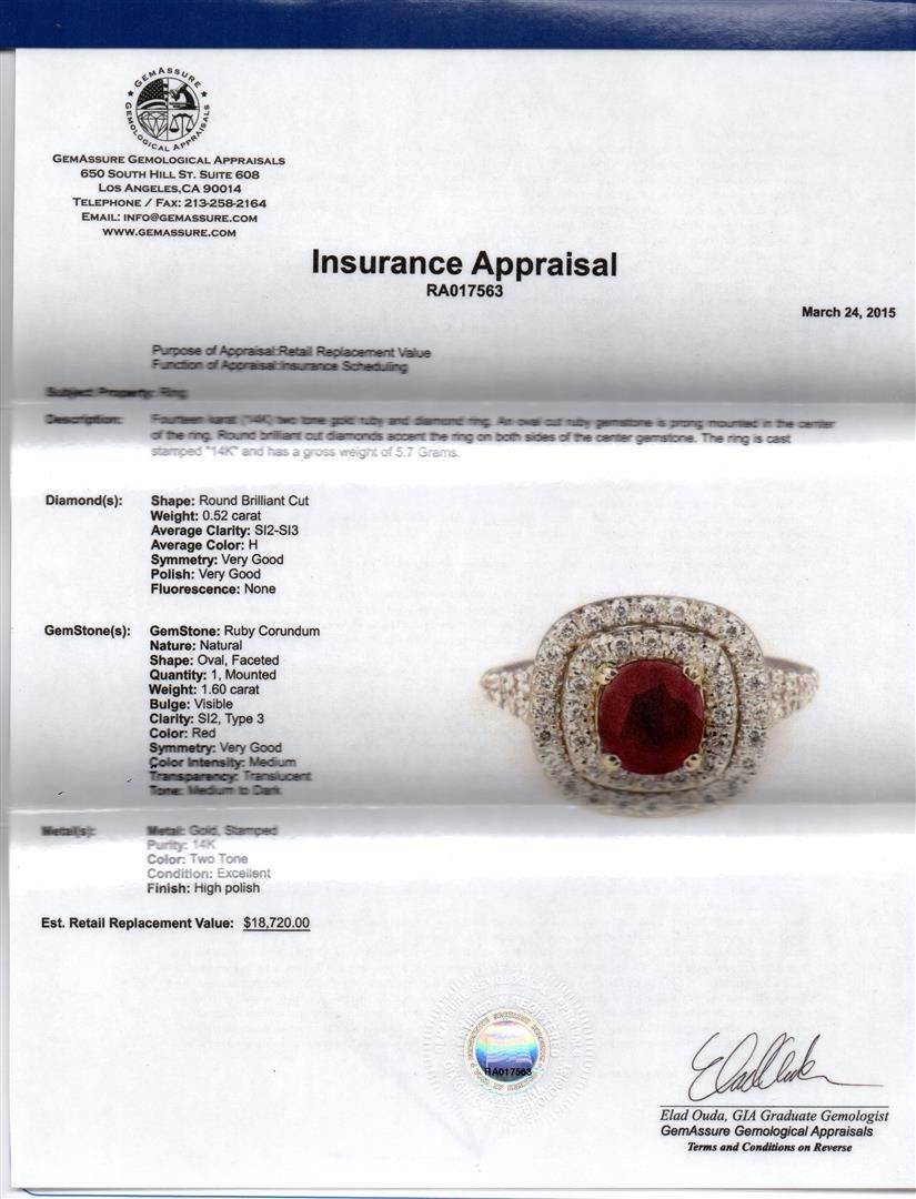 Fourteen karat (14K) two tone gold ruby and diamond ring. An oval cut ruby gemstone is prong mounted in the center of the ring. Round brilliant cut diamonds accent the ring on both sides of the center gemstone. The ring is cast stamped "14K" and has a gross weight of 5.7 Grams. Diamond(s): Shape: Round Brilliant Cut. Weight: 0.52 carat. Average Clarity: SI2-SI3. Average Color: H. Symmetry: Very Good. Polish: Very Good. Fluorescence: None. GemStone(s): GemStone: Ruby Corundum. Nature: Natural. Shape: Oval, Faceted. Quantity: 1, Mounted. Weight: 1.60 carat. Bulge: Visible. Clarity: SI2, Type 3. Color: Red. Symmetry: Very Good. Color Intensity: Medium. Transparency: Translucent. Tone: Medium to Dark. Metal(s): Metal: Gold, Stamped. Purity: 14K. Color: Two Tone. Condition: Excellent. Finish: High polish. GGA Appraised at $18,720.00.