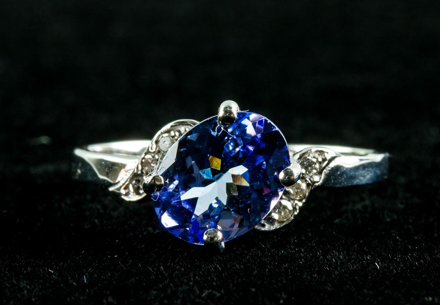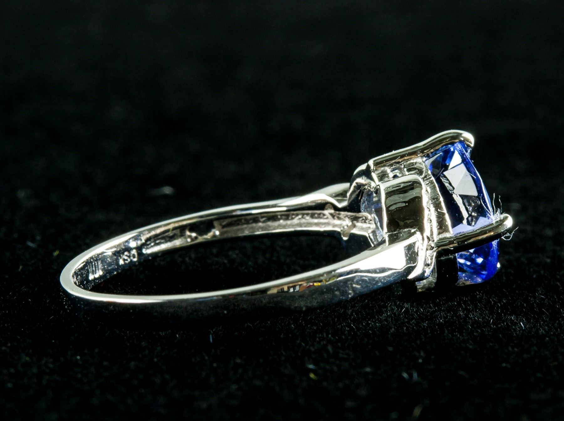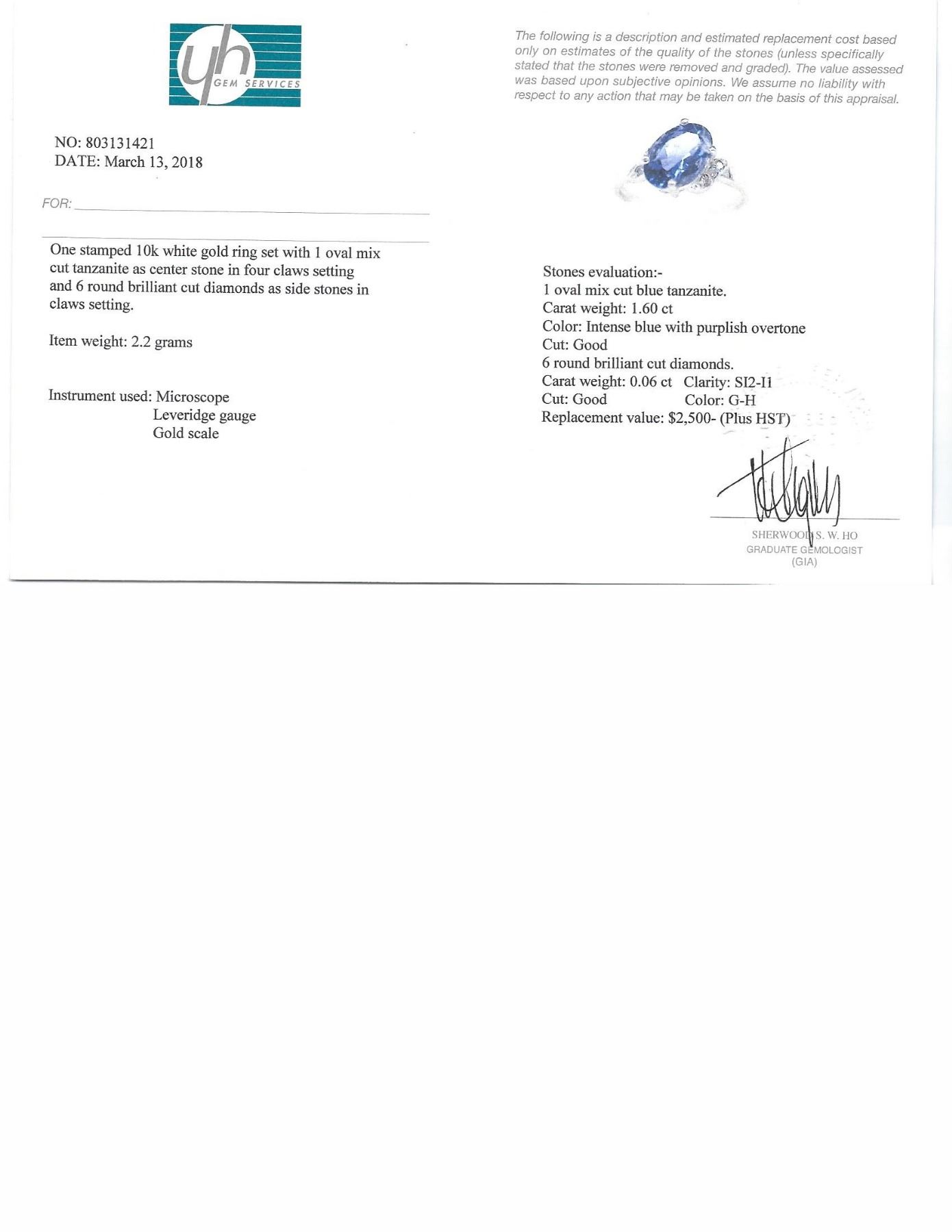 Stamped 10k white gold ring. Set with 1.60ct oval mix cut, intense blue with purplish overtone tanzanite with six, 0.06ct round brilliant cut, SI2-I1 clarity and G-H colored diamonds. Certified replacement value $2500. 2.2 grams.