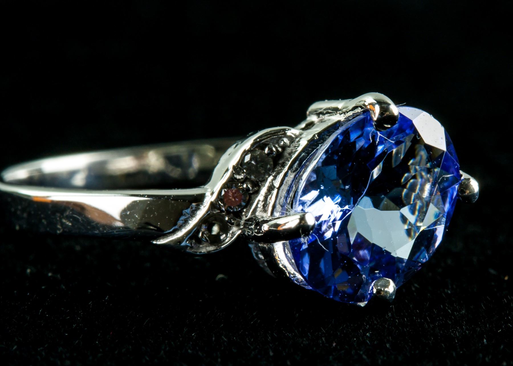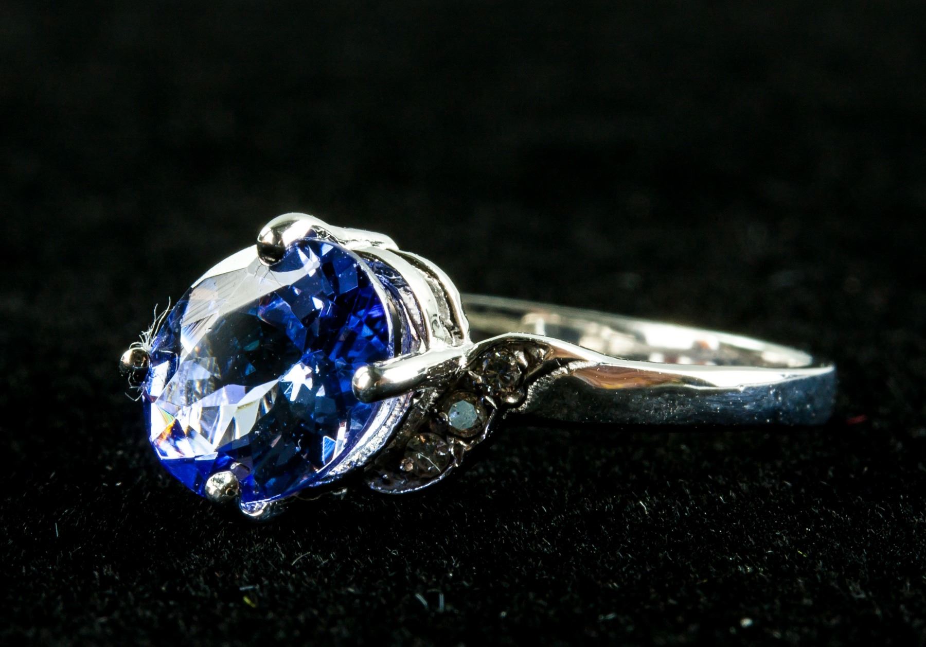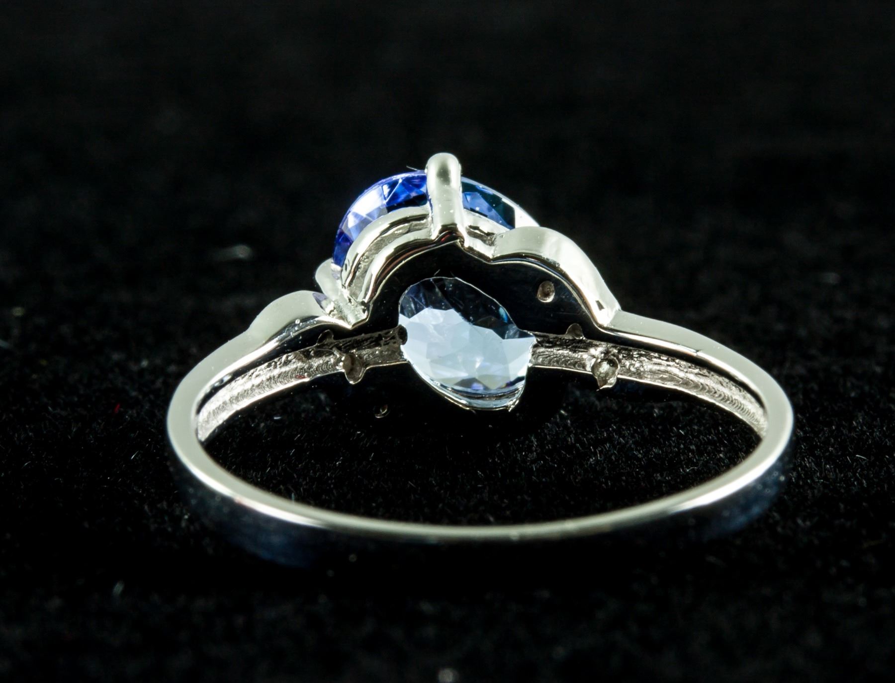 Stamped 10k white gold ring. Set with 1.60ct oval mix cut, intense blue with purplish overtone tanzanite with six, 0.06ct round brilliant cut, SI2-I1 clarity and G-H colored diamonds. Certified replacement value $2500. 2.2 grams.