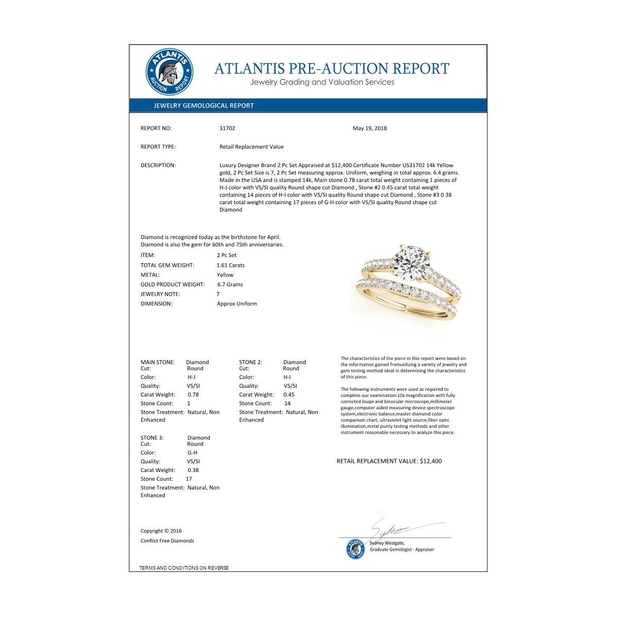 REF-225Y6K -31702 ---- 1.61 CTW Certified VS/SI Diamond Solitaire 2Pc Wedding Set 14K Yellow Gold ---- Luxury Designer Brand 2 Pc Set Appraised at $12,400 Certificate Number US31702 14k Yellow gold, 2 Pc Set Size is 7, 2 Pc Set measuring approx. Uniform, weighing in total approx. 6.4 grams. Made in the USA and is stamped 14k, Main stone 0.78 carat total weight containing 1 pieces of H-J color with VS/SI quality Round shape cut Diamond , Stone #2 0.45 carat total weight containing 14 pieces of H-I color with VS/SI quality Round shape cut Diamond , Stone #3 0.38 carat total weight containing 17 pieces of G-H color with VS/SI quality Round shape cut Diamond