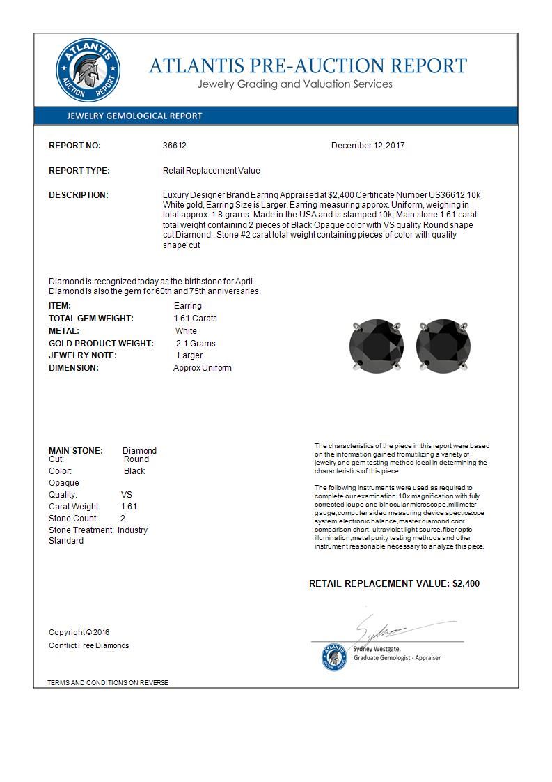36612 - REF-36M2F ---- 1.61 CTW Fancy Black VS Diamond Solitaire Stud Earrings 10K White Gold ---- Luxury Designer Brand Earring Appraised at $2,400 Certificate Number US36612 10k White gold, Earring Size is Larger, Earring measuring approx. Uniform, weighing in total approx. 1.8 grams. Made in the USA and is stamped 10k, Main stone 1.61 carat total weight containing 2 pieces of Black Opaque color with VS quality Round shape cut Diamond , Stone #2 carat total weight containing pieces of color with quality shape cut