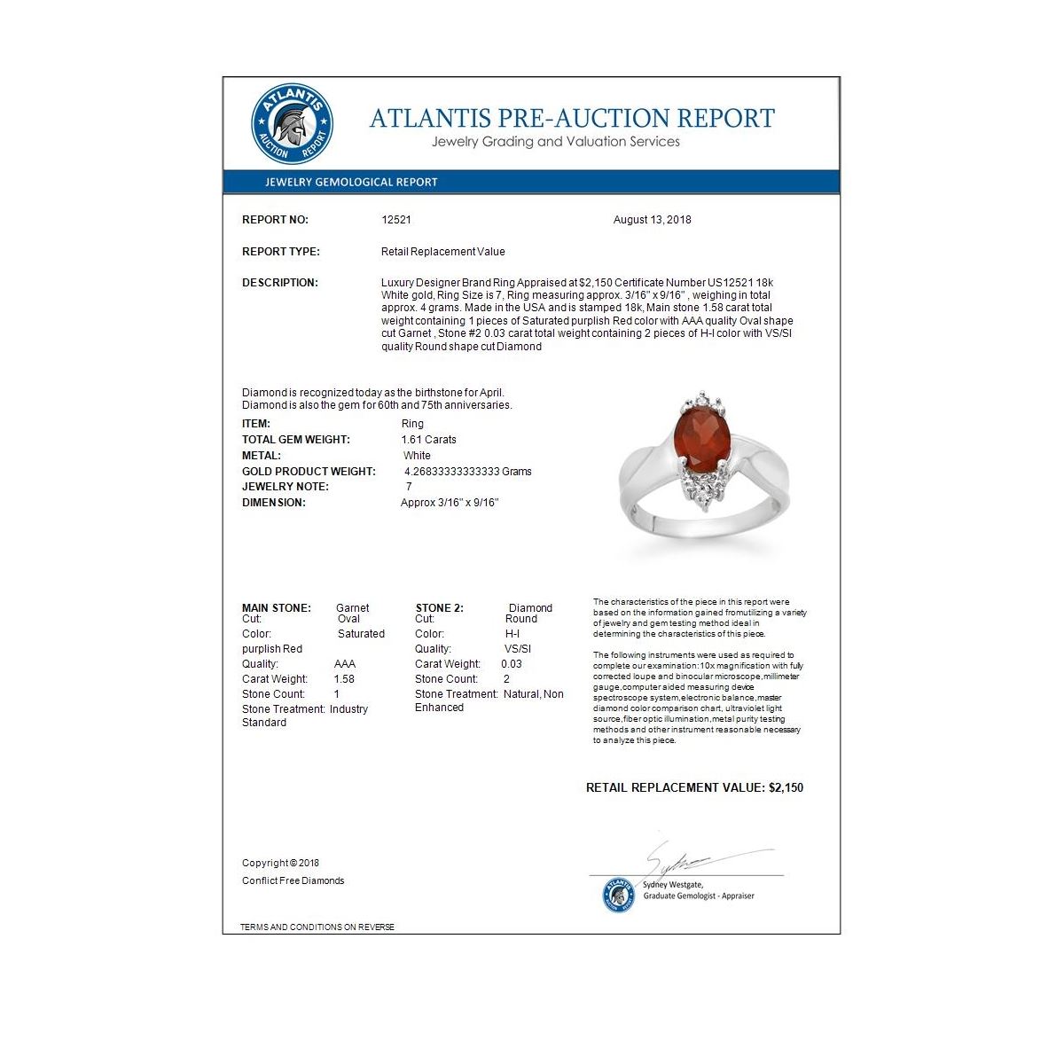 REF-35T3M -12521 ---- 1.61 CTW Garnet & Diamond Ring 18K White Gold ---- Luxury Designer Brand Ring Appraised at $2,150 Certificate Number US12521 18k White gold, Ring Size is 7, Ring measuring approx. 3/16" x 9/16" , weighing in total approx. 4 grams. Made in the USA and is stamped 18k, Main stone 1.58 carat total weight containing 1 pieces of Saturated purplish Red color with AAA quality Oval shape cut Garnet , Stone #2 0.03 carat total weight containing 2 pieces of H-I color with VS/SI quality Round shape cut Diamond
