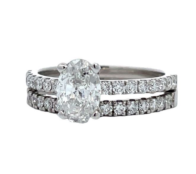 One electronically tested 14KT white gold lady's combination cast & assembled wedding set with a double straight line motif with a bright polish finish. The featured lady's wedding set has a double shank measuring 3.80 millimeters wide. Identified with markings of "14K". Condition is new, good workmanship. Containing: One prong set oval shaped cut diamond, measuring 7.85 x 5.40 x 3.70mm (depth est.) approximate weight of 1.00ct. Graded in the setting. Color G Clarity I-1 Cut Very Good Thirty-Four prong set round brilliant cut diamonds, measuring 1.70 - 1.65 x 1.01mm (depth est.) approximate total weight of 34 Stones = 0.61ct. Graded in the setting. Color G - H Clarity VS-2 to SI-1 Cut Very Good Total Weight of Diamonds 1.61ct. Total Weight of Wedding Set 4.30gm