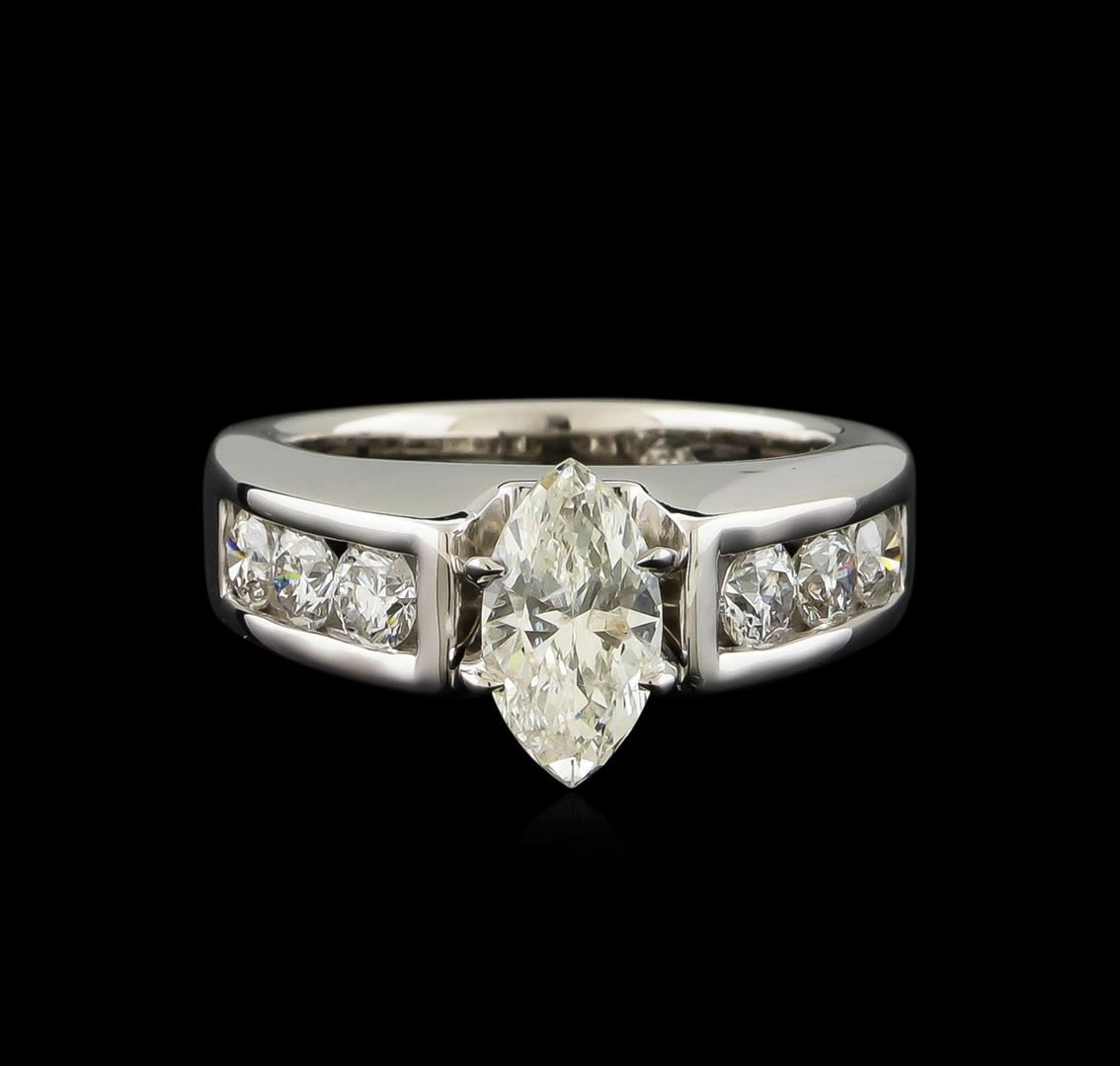 One electronically tested 14KT white gold lady's cast wedding ring with a cathedral shank with a bright polish finish. The featured lady's ring has a shank measuring 3.25 millimeters wide. Identified with markings of "14K". Condition is new, good workmanship. Containing: One prong set marquise shaped cut diamond, measuring 9.39 x 5.07 x 3.19mm (depth est.) , 10.00.%. GTCF approximate weight of 1.01ct. Graded in the setting. Clarity: I-1. Color: G - Good Six channel set round brilliant cut diamonds, measuring 3.20 - 3.00 x 1.86mm (depth est.) approximate total weight of 6 Stones = 0.60ct. Graded in the setting. Clarity: SI-1 to I-1. Color: G - Very Good. Total Weight of Diamonds 1.61ct. Total Weight of Ring 8.50gm GAS Appraised at $10,645.00.