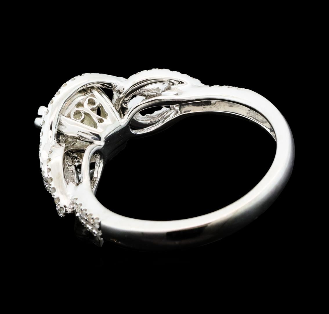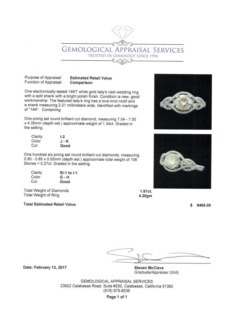 One electronically tested 14KT white gold lady's cast wedding ring with a split shank with a bright polish finish. The featured lady's ring has a love knot motif and a shank measuring 2.21 millimeters wide. Identified with markings of '14K'. Condition is new, good workmanship. Containing: One prong set round brilliant cut diamond, measuring 7.04 - 7.00 x 4.35mm (depth est.) approximate weight of 1.34ct. Graded in the setting. Clarity I-2. Color: J - K Cut Good One Hundred Six prong set round brilliant cut diamonds, measuring 0.90 - 0.85 x 0.55mm (depth est.) approximate total weight of 106 Stones = 0.27ct. Graded in the setting. Clarity SI-1 to I-1. Color: G - H Cut Good. Total Weight of Diamonds 1.61ct.. Total Weight of Ring 4.20gm. GAS Appraised at $8,465.00.