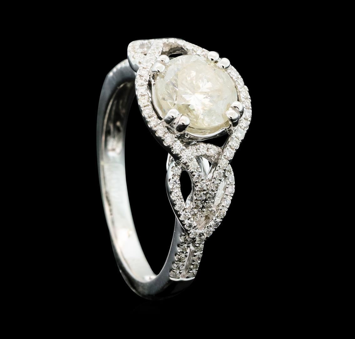 One electronically tested 14KT white gold lady's cast wedding ring with a split shank with a bright polish finish. The featured lady's ring has a love knot motif and a shank measuring 2.21 millimeters wide. Identified with markings of '14K'. Condition is new, good workmanship. Containing: One prong set round brilliant cut diamond, measuring 7.04 - 7.00 x 4.35mm (depth est.) approximate weight of 1.34ct. Graded in the setting. Clarity I-2. Color: J - K Cut Good One Hundred Six prong set round brilliant cut diamonds, measuring 0.90 - 0.85 x 0.55mm (depth est.) approximate total weight of 106 Stones = 0.27ct. Graded in the setting. Clarity SI-1 to I-1. Color: G - H Cut Good. Total Weight of Diamonds 1.61ct.. Total Weight of Ring 4.20gm. GAS Appraised.