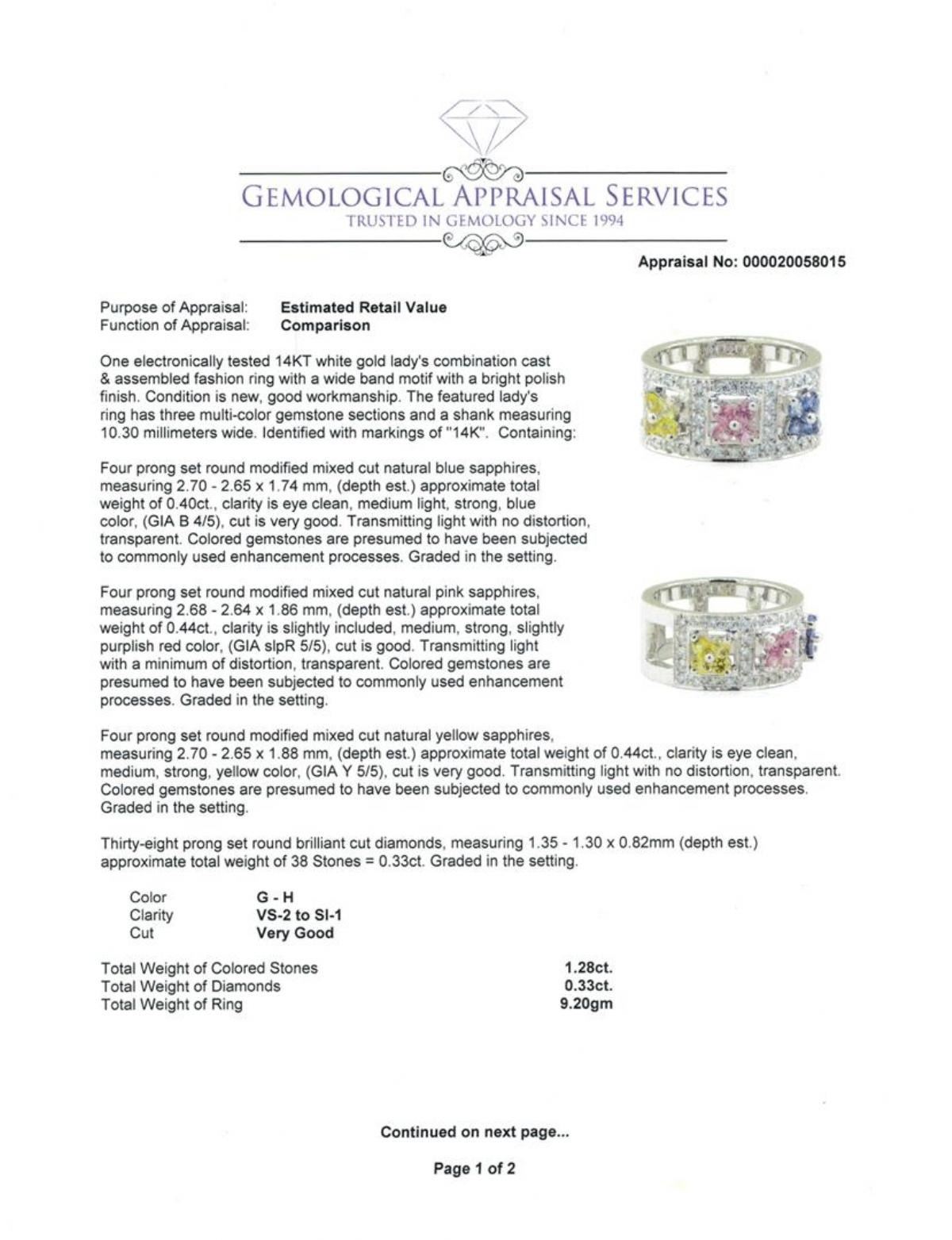 One electronically tested 14KT white gold lady's combination cast & assembled fashion ring with a wide band motif with a bright polish finish. The featured lady's ring has three multi-color gemstone sections and a shank measuring 10.30 millimeters wide. Identified with markings of '14K'. Condition is new, good workmanship. Containing: Four prong set round modified mixed cut natural blue sapphires, measuring 2.70 - 2.65 x 1.74 mm, (depth est.) approximate total weight of 0.40ct., clarity is eye clean, medium light, strong, blue color, (GIA B 4/5), cut is very good. Transmitting light with no distortion, transparent. Colored gemstones are presumed to have been subjected to commonly used enhancement processes. Graded in the setting. Four prong set round modified mixed cut natural pink sapphires, measuring 2.68 - 2.64 x 1.86 mm, (depth est.) approximate total weight of 0.44ct., clarity is slightly included, medium, strong, slightly purplish red color, (GIA slpR 5/5), cut is good. Transmitting light with a minimum of distortion, transparent. Colored gemstones are presumed to have been subjected to commonly used enhancement processes. Graded in the setting. Four prong set round modified mixed cut natural yellow sapphires, measuring 2.70 - 2.65 x 1.88 mm, (depth est.) approximate total weight of 0.44ct., clarity is eye clean, medium, strong, yellow color, (GIA Y 5/5), cut is very good. Transmitting light with no distortion, transparent. Colored gemstones are presumed to have been subjected to commonly used enhancement processes. Graded in the setting. Thirty-Eight prong set round brilliant cut diamonds, measuring 1.35 - 1.30 x 0.82mm (depth est.) approximate total weight of 38 Stones = 0.33ct. Graded in the setting. Color G - H Clarity VS-2 to SI-1 Cut Very Good. Total Weight of Colored Stones 1.28ct.. Total Weight of Diamonds 0.33ct.. Total Weight of Ring 9.20gm GAS Appraised at $4100.00. GAS Appraised.