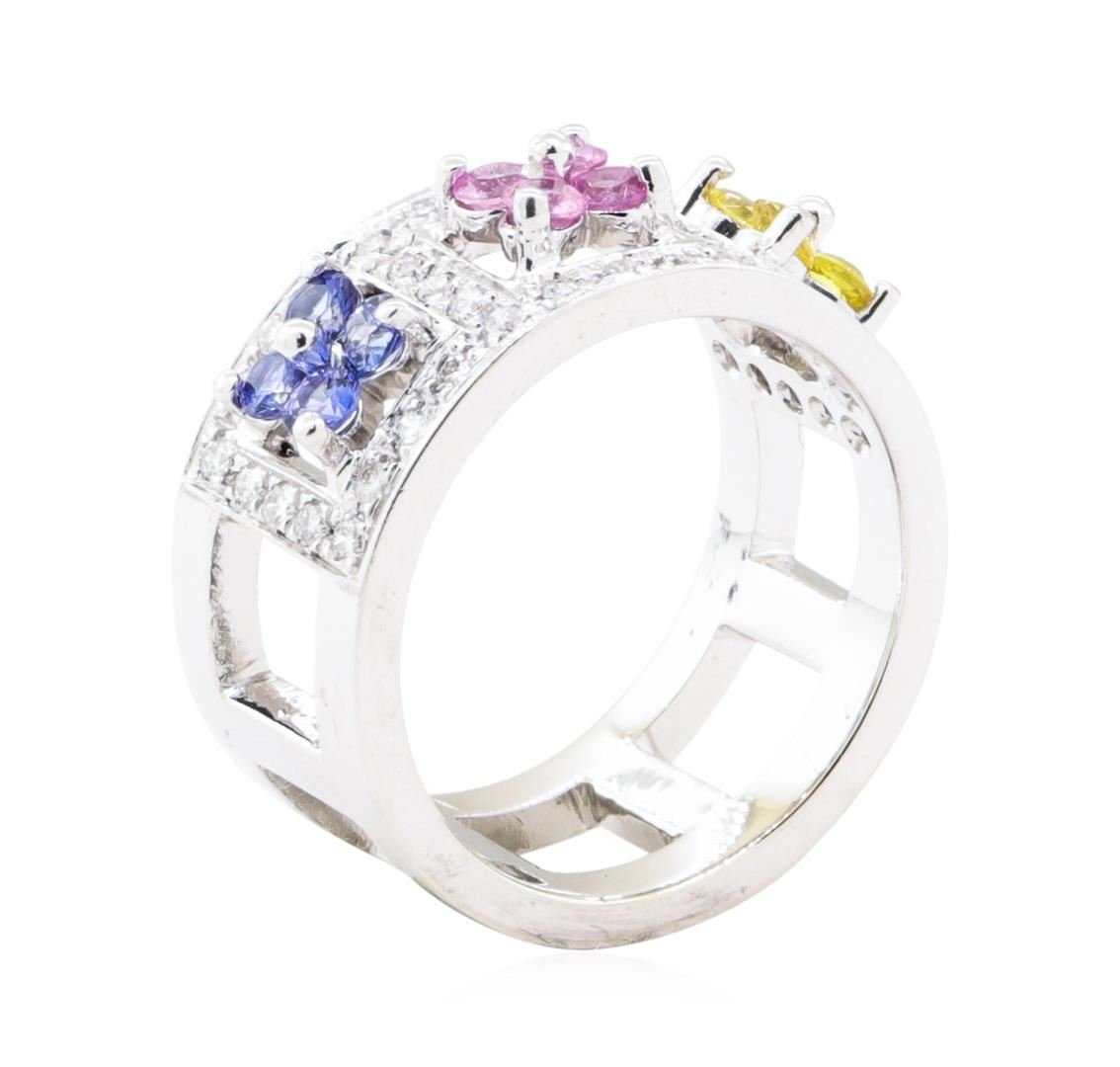 One electronically tested 14KT white gold lady's combination cast & assembled fashion ring with a wide band motif with a bright polish finish. The featured lady's ring has three multi-color gemstone sections and a shank measuring 10.30 millimeters wide. I
