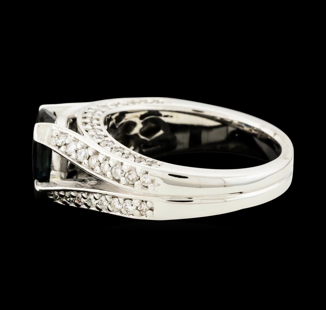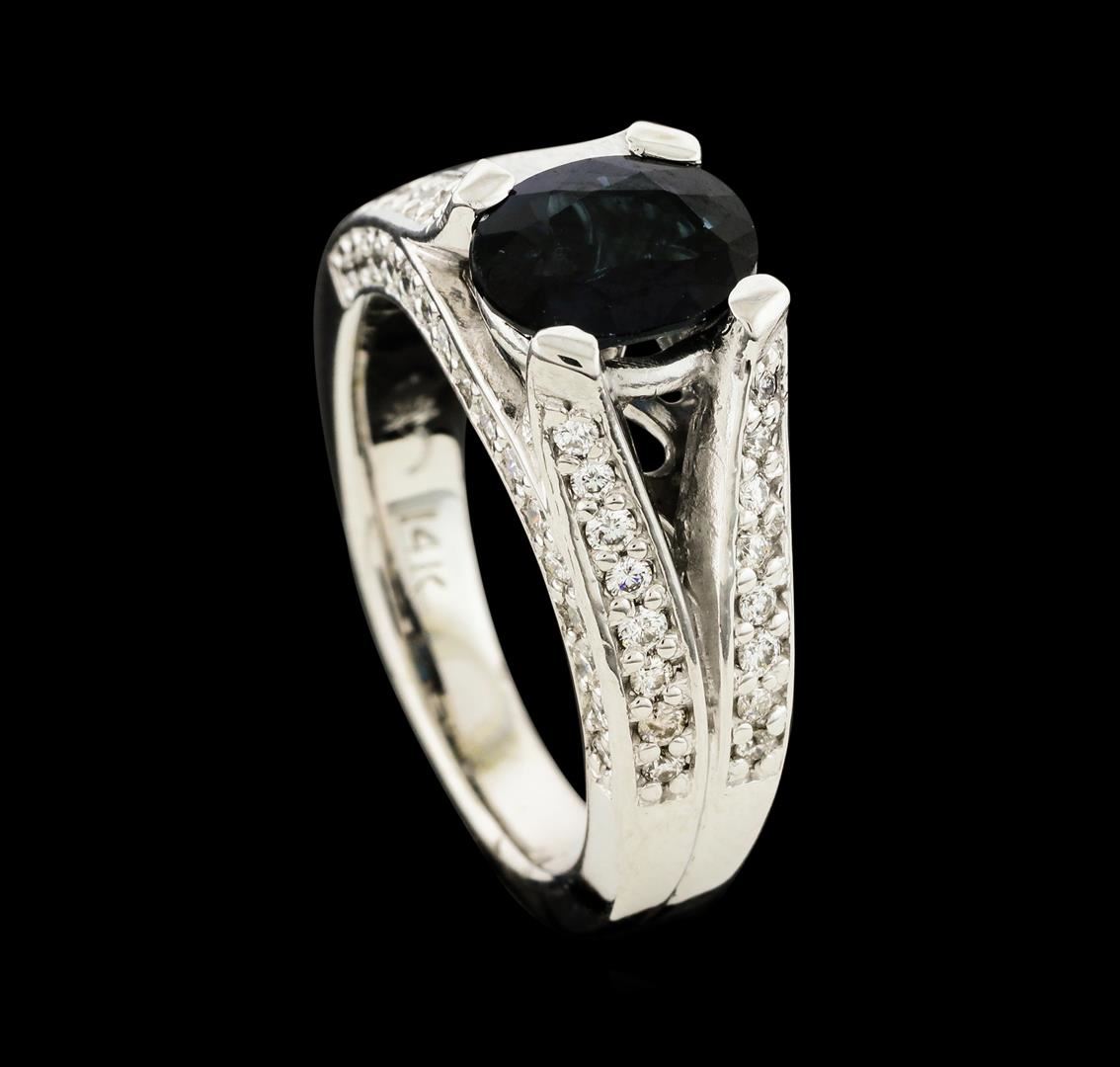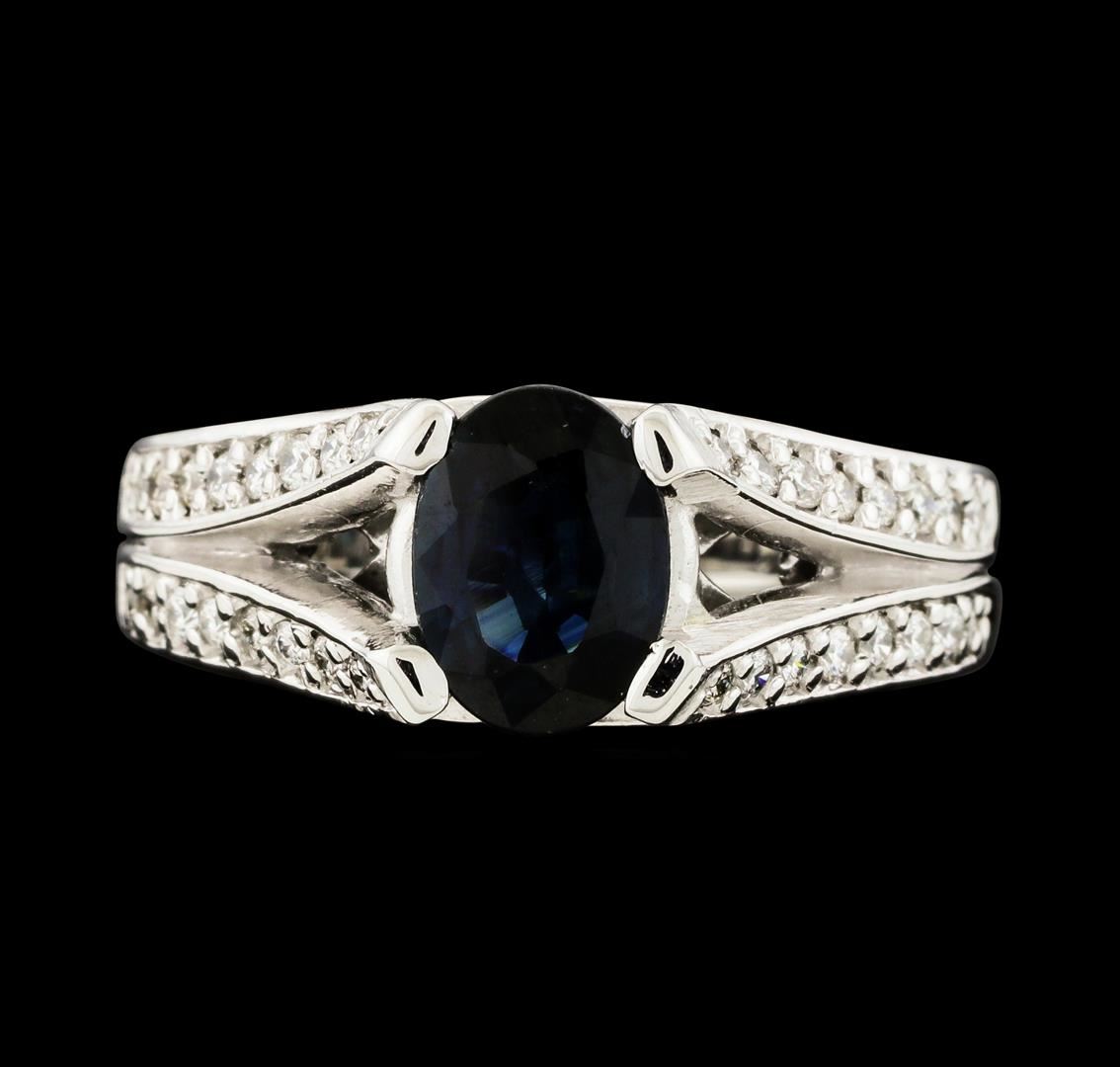 One electronically tested 14KT white gold lady's cast fashion ring with a split cathedral shank with a bright polish finish. The featured lady's ring has a double shank measuring 3.15 millimeters wide. Identified with markings of '14K'. Condition is new, good workmanship. Containing: One prong set oval modified mixed cut natural blue sapphire, measuring 8.35 x 6.15 x 3.10mm, (depth est.) 15%. bulge factor, approximate weight of 1.61ct., clarity is slightly included, dark, moderately strong, very slightly greenish blue color, (GIA vslgB 7/4), cut is good. Transmitting light with a minimum of distortion, transparent. Colored gemstones are presumed to have been subjected to commonly used enhancement processes. Graded in the setting. Sixty-Six prong set round brilliant cut diamonds, measuring 1.50 - 1.35 x 0.89mm (depth est.) approximate total weight of 66 Stones = 0.75ct. Graded in the setting. Clarity VS-2 to SI-1. Color: H - J Cut Good. Total Weight of Colored Stones 1.61ct.. Total Weight of Diamonds 0.75ct.. Total Weight of Ring 7.60gm. GAS Appraised at $5,150.00.
