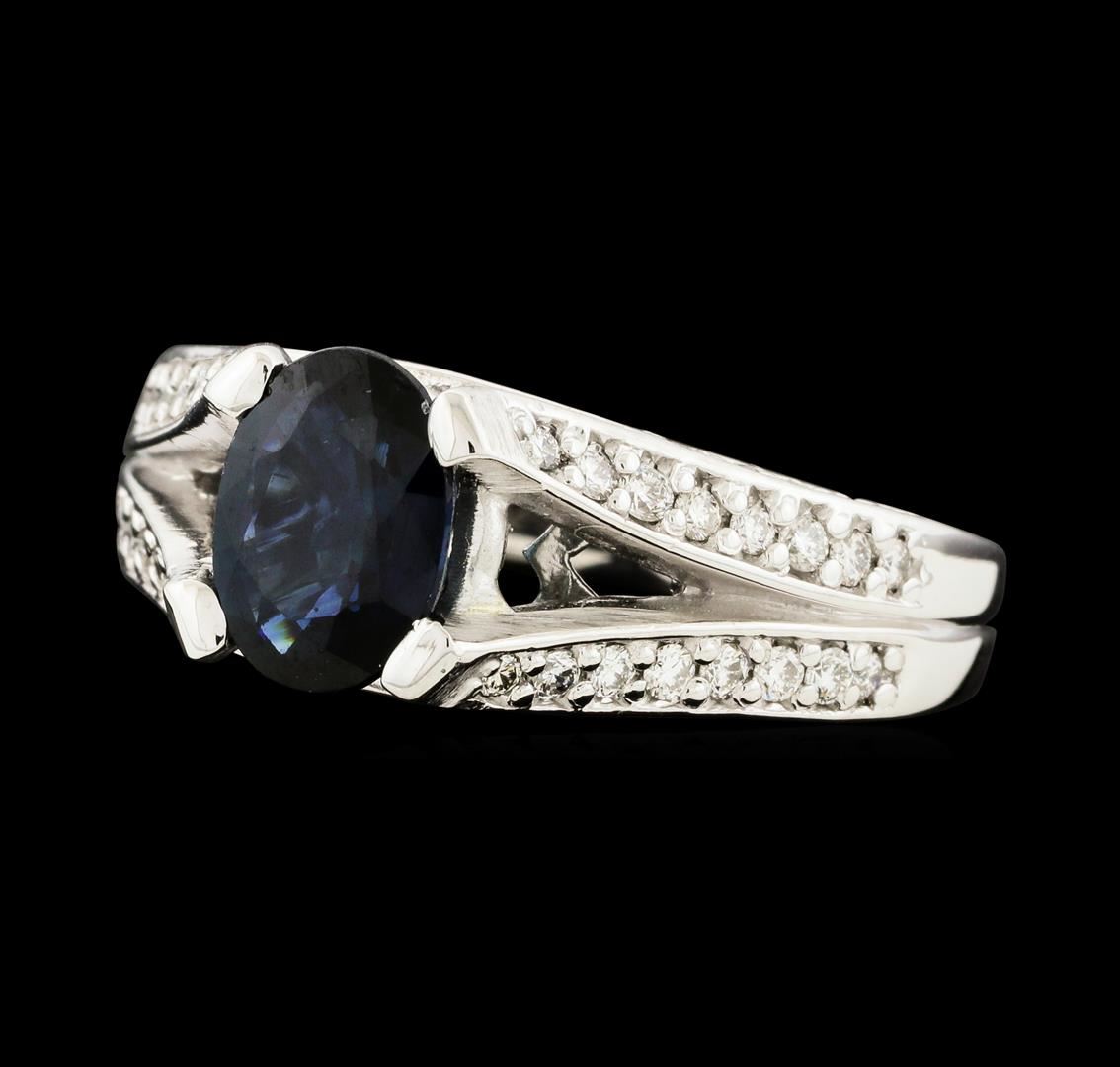 One electronically tested 14KT white gold lady's cast fashion ring with a split cathedral shank with a bright polish finish. The featured lady's ring has a double shank measuring 3.15 millimeters wide. Identified with markings of '14K'. Condition is new, good workmanship. Containing: One prong set oval modified mixed cut natural blue sapphire, measuring 8.35 x 6.15 x 3.10mm, (depth est.) 15%. bulge factor, approximate weight of 1.61ct., clarity is slightly included, dark, moderately strong, very slightly greenish blue color, (GIA vslgB 7/4), cut is good. Transmitting light with a minimum of distortion, transparent. Colored gemstones are presumed to have been subjected to commonly used enhancement processes. Graded in the setting. Sixty-Six prong set round brilliant cut diamonds, measuring 1.50 - 1.35 x 0.89mm (depth est.) approximate total weight of 66 Stones = 0.75ct. Graded in the setting. Clarity VS-2 to SI-1. Color: H - J Cut Good. Total Weight of Colored Stones 1.61ct.. Total Weight of Diamonds 0.75ct.. Total Weight of Ring 7.60gm. GAS Appraised at $5,150.00.