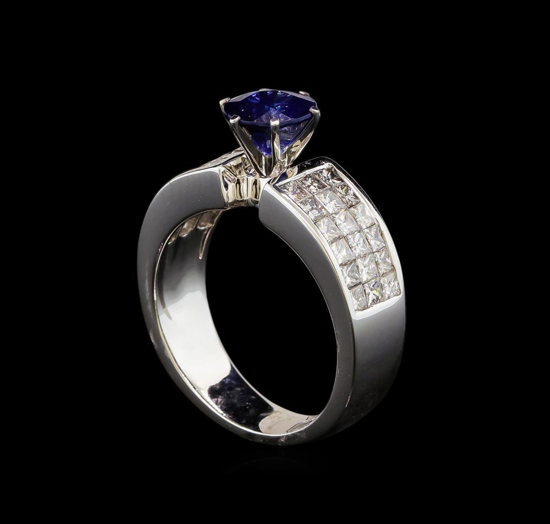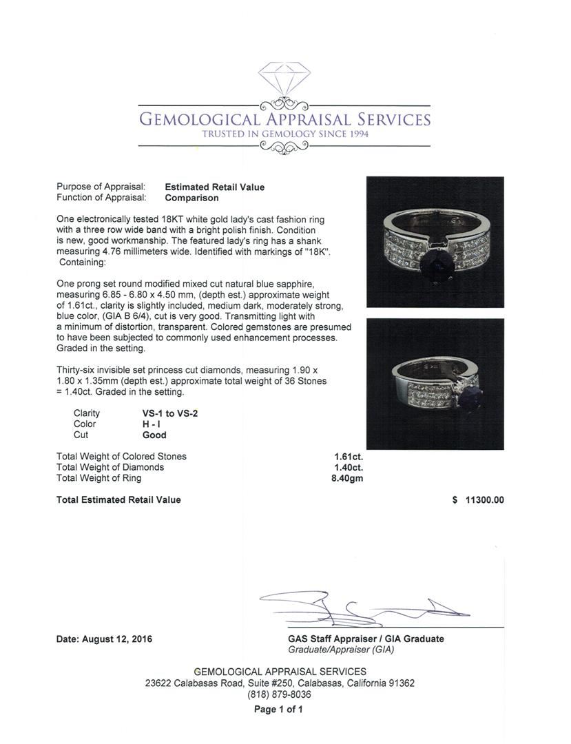 One electronically tested 18KT white gold lady's cast fashion ring with a three row wide band with a bright polish finish. The featured lady's ring has a shank measuring 4.76 millimeters wide. Identified with markings of '18K'. Condition is new, good workmanship. Containing: One prong set round modified mixed cut natural blue sapphire, measuring 6.85 - 6.80 x 4.50 mm, (depth est.) approximate weight of 1.61ct., clarity is slightly included, medium dark, moderately strong, blue color, (GIA B 6/4), cut is very good. Transmitting light with a minimum of distortion, transparent. Colored gemstones are presumed to have been subjected to commonly used enhancement processes. Graded in the setting. Thirty-Six invisible set princess cut diamonds, measuring 1.90 x 1.80 x 1.35mm (depth est.) approximate total weight of 36 Stones = 1.40ct. Graded in the setting. Clarity VS-1 to VS-2. Color: H - I Cut Good. Total Weight of Colored Stones 1.61ct.. Total Weight of Diamonds 1.40ct.. Total Weight of Ring 8.40gm. GAS Appraised at $11,300.00.