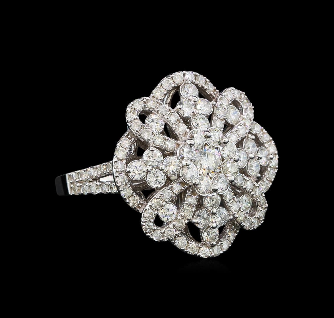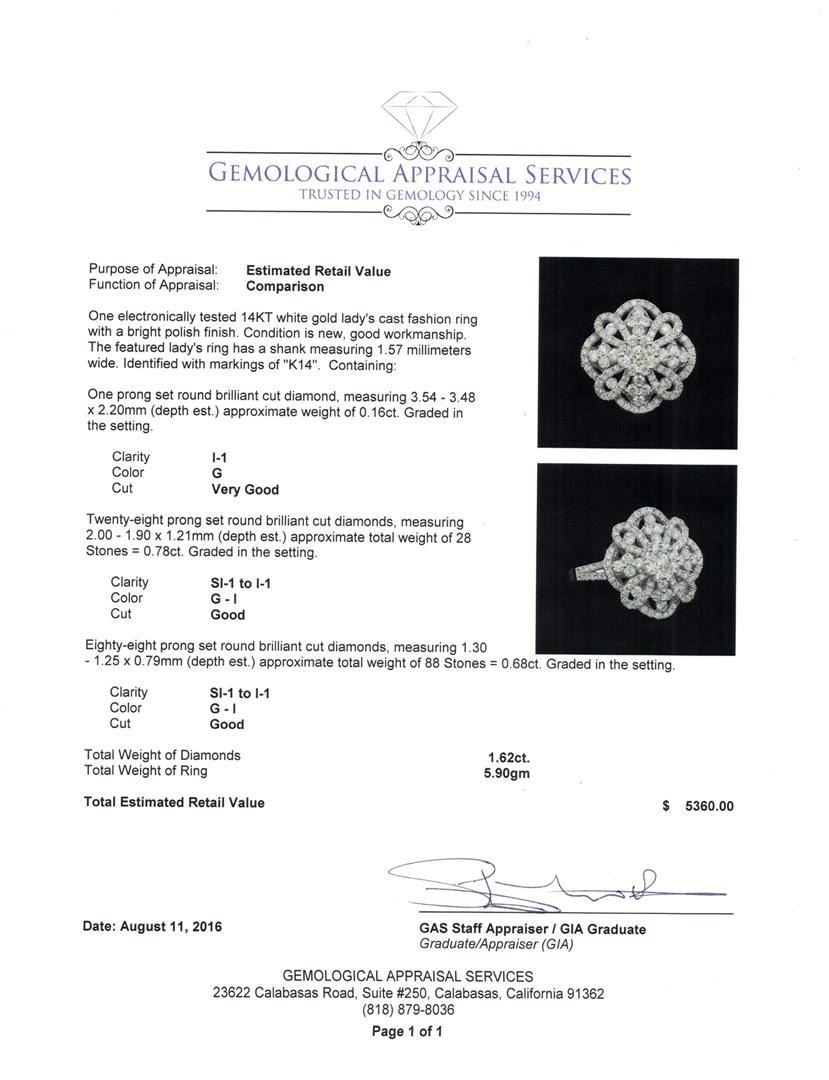 One electronically tested 14KT white gold lady's cast fashion ring with a bright polish finish. The featured lady's ring has a shank measuring 1.57 millimeters wide. Identified with markings of 'K14'. Condition is new, good workmanship. Containing: One prong set round brilliant cut diamond, measuring 3.54 - 3.48 x 2.20mm (depth est.) approximate weight of 0.16ct. Graded in the setting. Clarity I-1. Color: G Cut Very Good Twenty-Eight prong set round brilliant cut diamonds, measuring 2.00 - 1.90 x 1.21mm (depth est.) approximate total weight of 28 Stones = 0.78ct. Graded in the setting. Clarity SI-1 to I-1. Color: G - I Cut Good Eighty-Eight prong set round brilliant cut diamonds, measuring 1.30 - 1.25 x 0.79mm (depth est.) approximate total weight of 88 Stones = 0.68ct. Graded in the setting. Clarity SI-1 to I-1. Color: G - I Cut Good. Total Weight of Diamonds 1.62ct.. Total Weight of Ring 5.90gm. GAS Appraised at $5,360.00.
