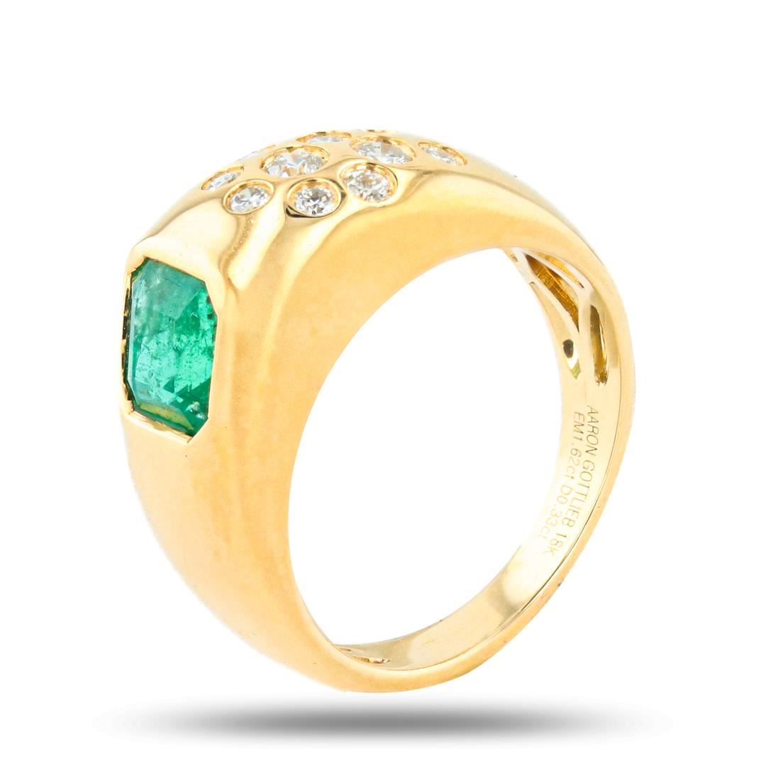 Eighteen karat (18K) yellow gold natural emerald beryl and diamond ring. An octagonal step cut natural emerald beryl gemstone is mounted in the center of the ring. Round brilliant cut diamonds accent the ring on one side of the center gemstone. The ring has a gross weight of 7.5 Grams. Brand: Aaron Gottlieb #NATURAL GEMSTONE# GEMSTONE: Emerald Beryl NATURE: Natural SHAPE: Octagonal Step, Faceted Cut WEIGHT: 1.62 carat total DIMENSIONS: 6.64 x 6.52mm CLARITY: Type 3 COLOR: Green (5/5) SYMMETRY: Excellent COLOR INTENSITY: Intense TRANSPARENCY: Transparent TONE: Dark #NATURAL DIAMOND# SHAPE: Round Brilliant Cut WEIGHT: 0.33 carat total (10pcs.) DIMENSIONS: 2.7 x 2.0mm AVERAGE CLARITY: VS2-SI2 AVERAGE COLOR: G-H SYMMETRY: Excellent POLISH: Excellent #METAL# METAL: Gold PURITY: 18K (750) COLOR: Yellow CONDITION: Excellent FINISH: High Polish Size: 6 3/4