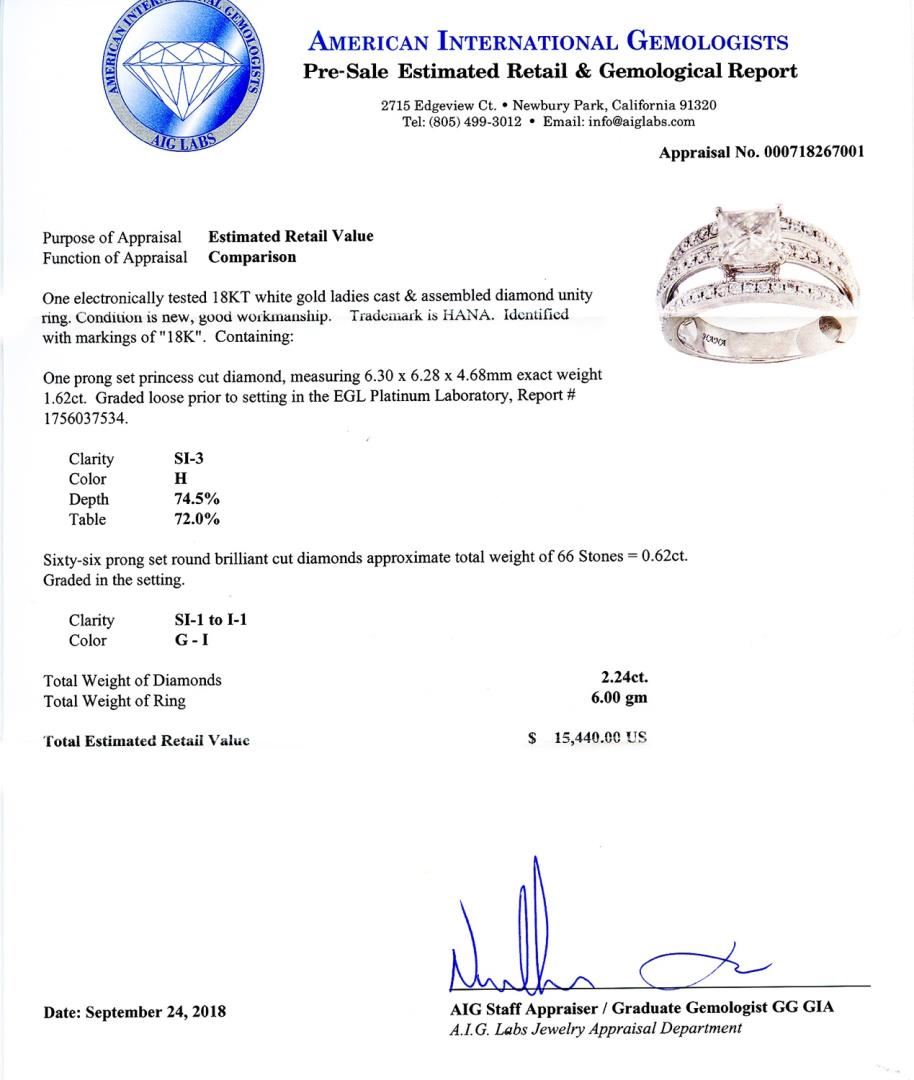 One electronically tested 18KT white gold ladies cast & assembled diamond unity ring. Condition is new, good workmanship. Trademark is HANA. Identified with markings of "18K". Containing: One prong set princess cut diamond, measuring 6.30 x 6.28 x 4.68mm exact weight 1.62ct. Graded loose prior to setting in the EGL Platinum Laboratory, Report # 1756037534. Clarity SI3 Color H Depth 74.5% Table 72.0% Sixty-six prong set round brilliant cut diamonds approximate total weight of 66 Stones = 0.62ctw. Graded in the setting. Clarity SI1 to I1 Color G - I Total Weight of Diamonds 2.24ctw. Total Weight of Ring 6.00 gm Size: 6 1/4