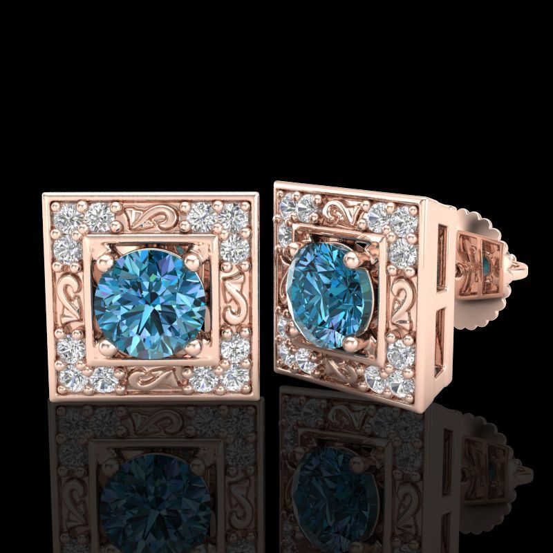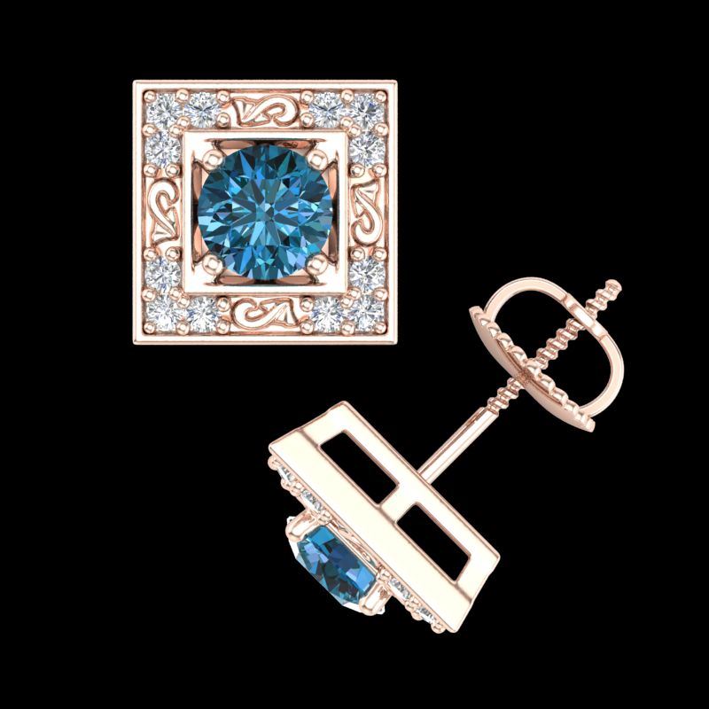 1.63 CTW Fancy Intense Blue Diamond Art Deco Stud Earrings 18K Rose Gold ---- Luxury Designer Brand Earring Appraised Retail Price at $10,650 ---- SKU Number US38161 18k Rose gold Earring Size is Larger, Earring measuring approx. Uniform, weighing in total approx. 7.5 grams. Made in the USA and is stamped 18k, Main stone 1.15 carat total weight containing 2 pieces of Intense Fancy Blue color with SI quality Round shape cut Diamond , Stone #2 0.48 carat total weight containing 24 pieces of H-I color with VS/SI quality Round shape cut