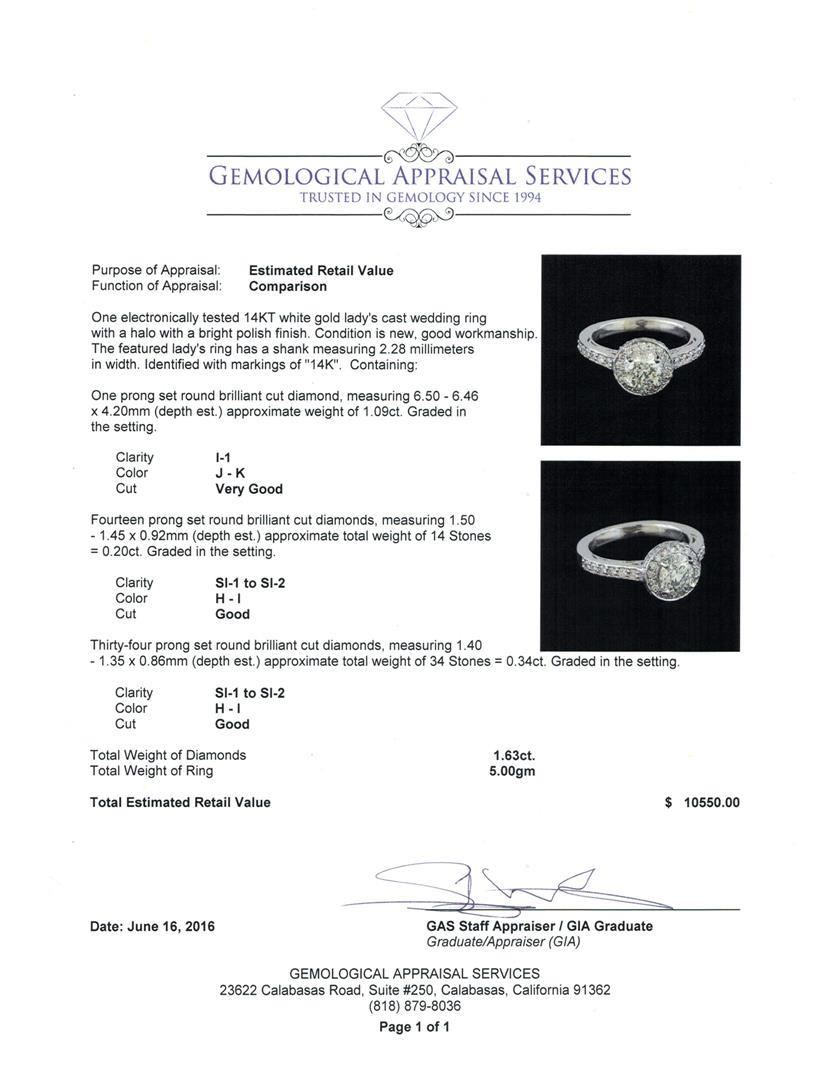 One electronically tested 14KT white gold lady's cast wedding ring with a halo with a bright polish finish. The featured lady's ring has a shank measuring 2.28 millimeters in width. Identified with markings of "14K". Condition is new, good workmanship. Containing: One prong set round brilliant cut diamond, measuring 6.50 - 6.46 x 4.20mm (depth est.) approximate weight of 1.09ct. Graded in the setting. Clarity: I-1. Color: J - K. Cut Very Good Fourteen prong set round brilliant cut diamonds, measuring 1.50 - 1.45 x 0.92mm (depth est.) approximate total weight of 14 Stones = 0.20ct. Graded in the setting. Clarity: SI-1 to SI-2. Color: H - I. Cut Good Thirty-Four prong set round brilliant cut diamonds, measuring 1.40 - 1.35 x 0.86mm (depth est.) approximate total weight of 34 Stones = 0.34ct. Graded in the setting. Clarity: SI-1 to SI-2. Color: H - I. Cut Good. Total Weight of Diamonds 1.63ct. Total Weight of Ring 5.00gm GAS Appraised.