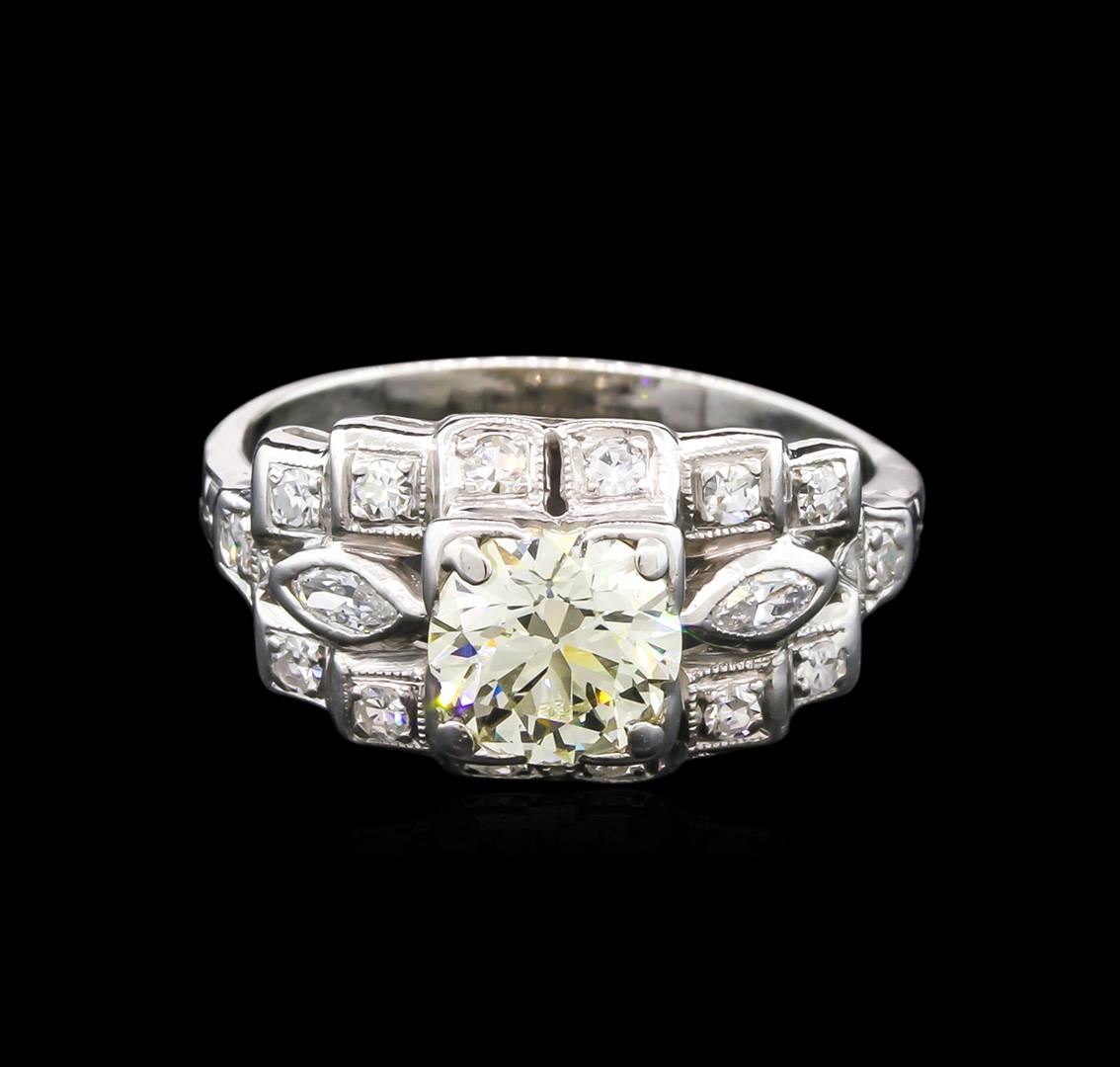 One electronically tested platinum lady's combination cast & assembled vintage wedding ring with a bright polish finish. The featured lady's ring has a shank measuring 1.87 millimeters wide. Condition is used, good workmanship. Containing: One prong set Old European cut diamond, measuring 6.40 - 6.35 x 3.82mm (depth est.) , 10.00.%. GTCF approximate weight of 1.08ct. Abrasions on girdle. Graded in the setting. Clarity: VS-1. Color: Good Two bezel set marquise shaped cut diamonds, measuring 4.00 x 1.70 x 1.11mm (depth est.) approximate total weight of 2 Stones = 0.10ct. Graded in the setting. Clarity: SI-1. Color: G - Very Good Fourteen prong set single cut diamonds, measuring 2.00 - 1.90 x 1.27mm (depth est.) approximate total weight of 14 Stones = 0.45ct. Graded in the setting. Clarity: VS-1 to SI-1. Color: G - Good. Total Weight of Diamonds 1.63ct. Total Weight of Wedding Ring 3.50gm. GAS Appraised at $12,000.00.