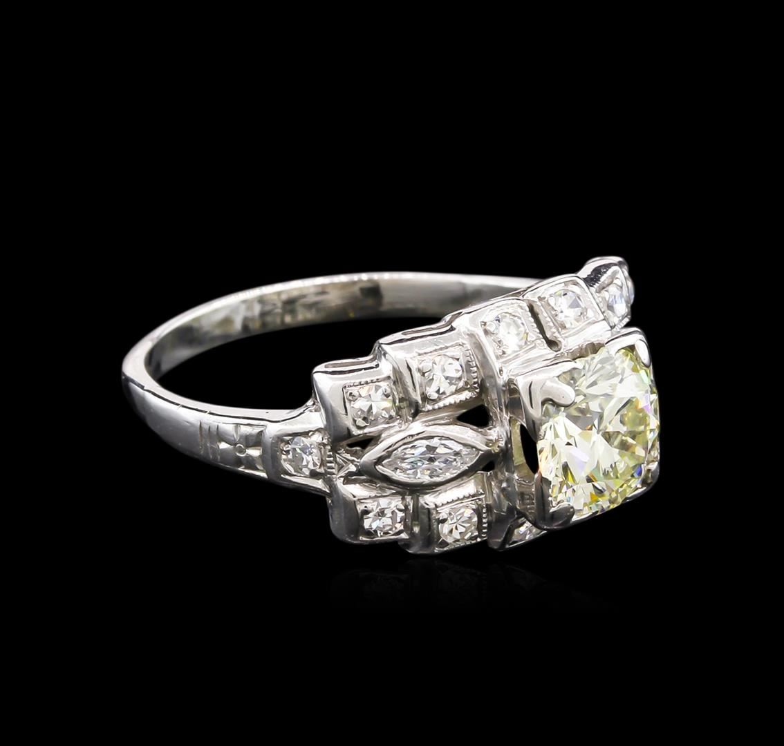 One electronically tested platinum lady's combination cast & assembled vintage wedding ring with a bright polish finish. The featured lady's ring has a shank measuring 1.87 millimeters wide. Condition is used, good workmanship. Containing: One prong set Old European cut diamond, measuring 6.40 - 6.35 x 3.82mm (depth est.) , 10.00.%. GTCF approximate weight of 1.08ct. Abrasions on girdle. Graded in the setting. Clarity: VS-1. Color: Good Two bezel set marquise shaped cut diamonds, measuring 4.00 x 1.70 x 1.11mm (depth est.) approximate total weight of 2 Stones = 0.10ct. Graded in the setting. Clarity: SI-1. Color: G - Very Good Fourteen prong set single cut diamonds, measuring 2.00 - 1.90 x 1.27mm (depth est.) approximate total weight of 14 Stones = 0.45ct. Graded in the setting. Clarity: VS-1 to SI-1. Color: G - Good. Total Weight of Diamonds 1.63ct. Total Weight of Wedding Ring 3.50gm. GAS Appraised at $12,000.00.