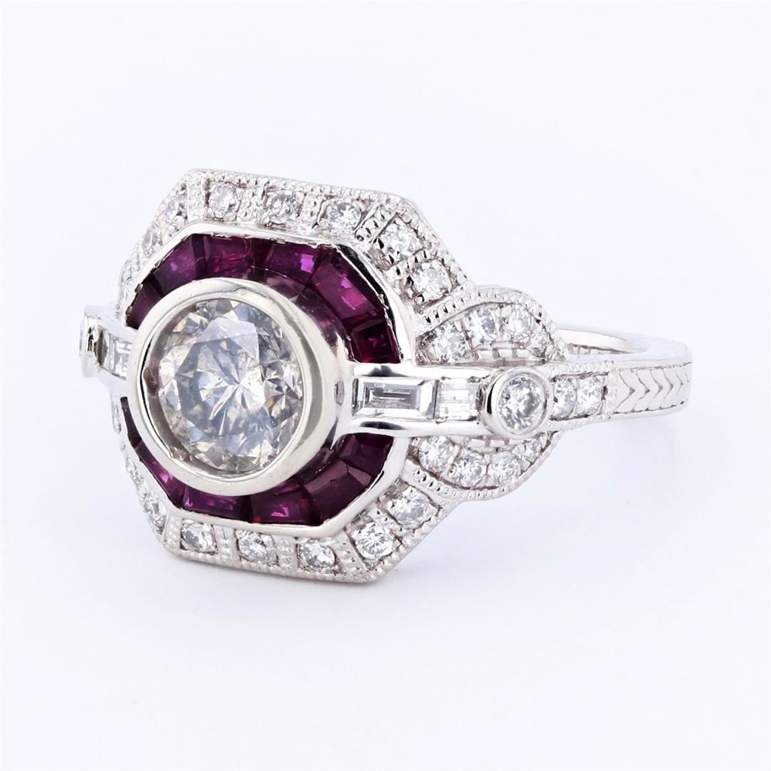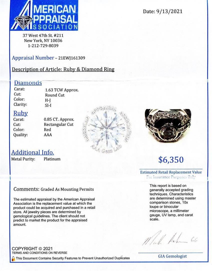 Description of Article: Ruby & Diamond Ring Diamonds Carat: 1.63 CTW Approx. Cut: Round Cut Color: H - J Clarity: SI to I Ruby Carat: 0.85 CT. Approx. Cut: Rectangular Cut Color: Red Quality: AAA Additional Info. Metal Purity: Platinum