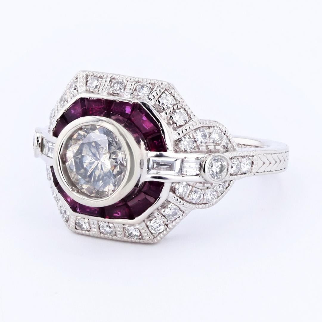 Description of Article: Ruby & Diamond Ring Diamonds Carat: 1.63 CTW Approx. Cut: Round Cut Color: H - J Clarity: SI to I Ruby Carat: 0.85 CT. Approx. Cut: Rectangular Cut Color: Red Quality: AAA Additional Info. Metal Purity: Platinum #Size: 6 1/2