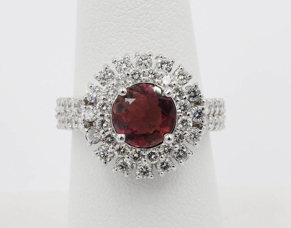 One engagement ring featuring: 14KT white gold weighing 7.47 grams containing one pink tourmaline weighing 1.63ct and 52 diamonds weighing 1.40ctw. The pink tourmaline is round brilliant cut with fine clarity, pink color and a very good cut. The diamonds