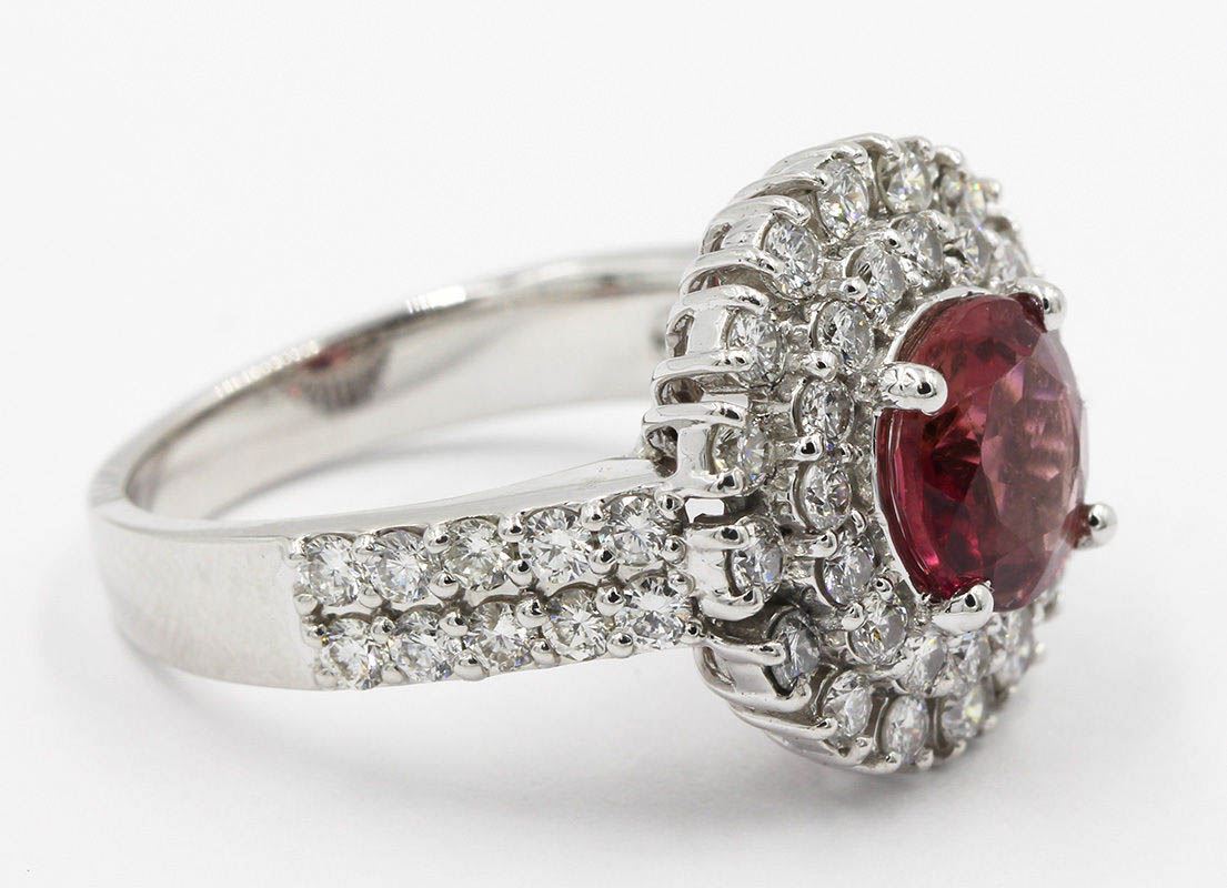 One engagement ring featuring: 14KT white gold weighing 7.47 grams containing one pink tourmaline weighing 1.63ct and 52 diamonds weighing 1.40ctw. The pink tourmaline is round brilliant cut with fine clarity, pink color and a very good cut. The diamonds