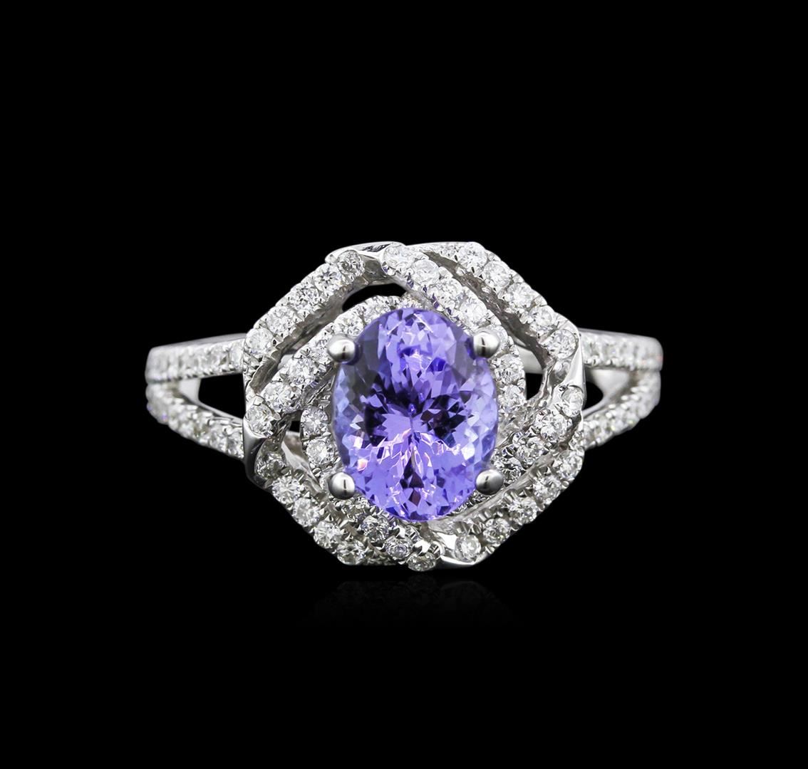 One electronically tested 18KT white gold ladies cast tanzanite and diamond ring with a bright polish finish. Identified with markings of "K18". Condition is new. Containing: One prong set oval modified brilliant cut natural tanzanite, measuring 8.49 x 6.48 x 4.21mm, approximate weight of 1.63ct., clarity is eye clean, type I, medium light, very slightly grayish, violet color, (GIA V 4/3), cut is good. Eighty prong set round brilliant cut diamonds, measuring 1.20 - 1.20 x 0.72mm (depth est.) approximate total weight of 80 Stones = 0.55ct. Clarity: SI-1 to SI-2. Color: H - I, Cut is Good. Colored gemstones are presumed to have been subjected to commonly used enhancement processes. All diamonds and colored gemstones are graded in the mounting, unless otherwise stated. Total Weight of Colored Stones 1.63ct. Total Weight of Diamonds 0.55ct. Total Weight of Ring 6.10 grams. GGL Appraised at $3,130.00.