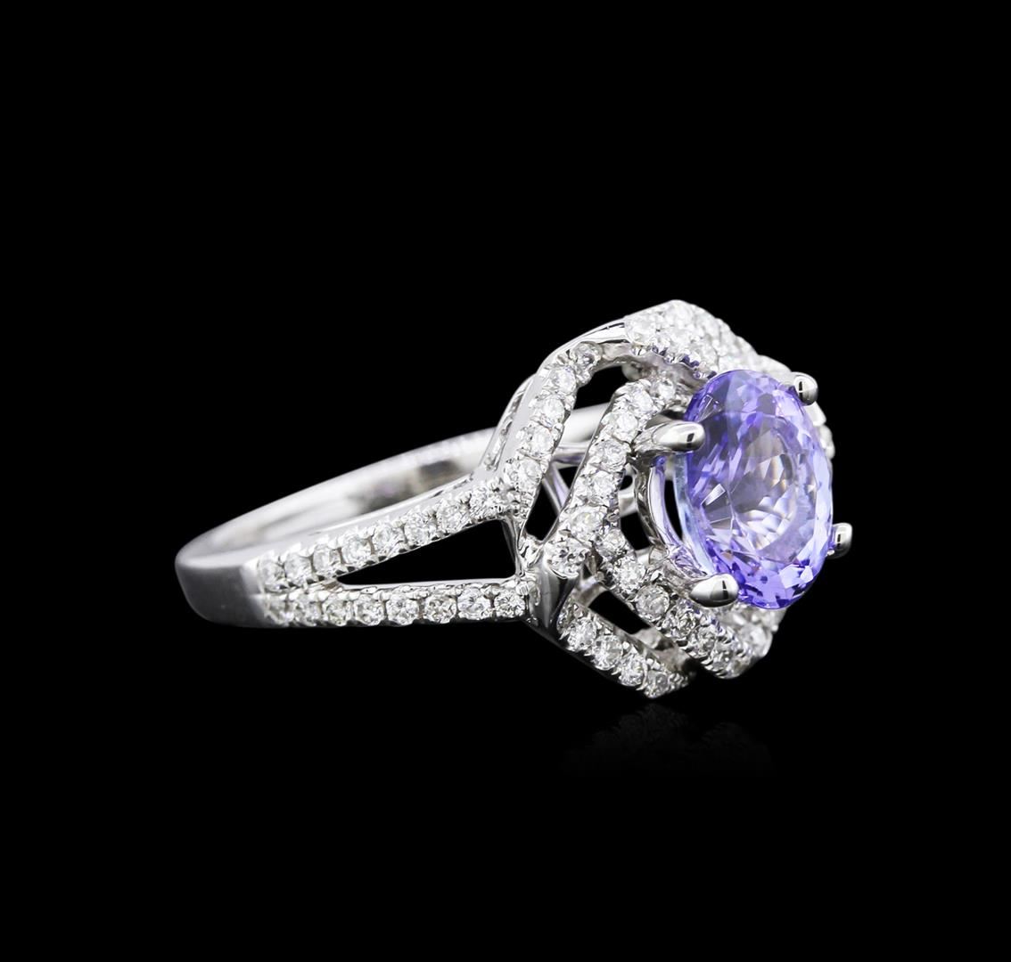 One electronically tested 18KT white gold ladies cast tanzanite and diamond ring with a bright polish finish. Identified with markings of "K18". Condition is new. Containing: One prong set oval modified brilliant cut natural tanzanite, measuring 8.49 x 6.48 x 4.21mm, approximate weight of 1.63ct., clarity is eye clean, type I, medium light, very slightly grayish, violet color, (GIA V 4/3), cut is good. Eighty prong set round brilliant cut diamonds, measuring 1.20 - 1.20 x 0.72mm (depth est.) approximate total weight of 80 Stones = 0.55ct. Clarity: SI-1 to SI-2. Color: H - I, Cut is Good. Colored gemstones are presumed to have been subjected to commonly used enhancement processes. All diamonds and colored gemstones are graded in the mounting, unless otherwise stated. Total Weight of Colored Stones 1.63ct. Total Weight of Diamonds 0.55ct. Total Weight of Ring 6.10 grams. GGL Appraised at $3,130.00.