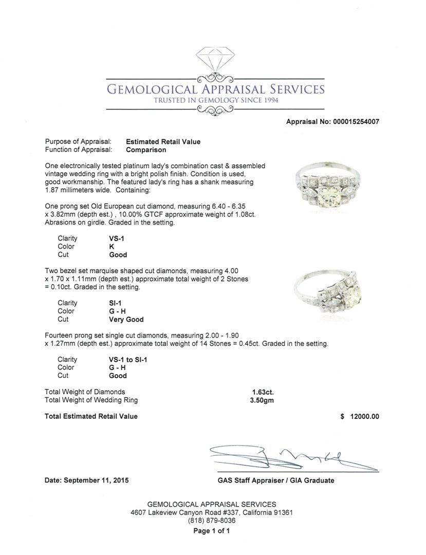 One electronically tested platinum lady's combination cast & assembled vintage wedding ring with a bright polish finish. The featured lady's ring has a shank measuring 1.87 millimeters wide. Condition is used, good workmanship. Containing: One prong set Old European cut diamond, measuring 6.40 - 6.35 x 3.82mm (depth est.) , 10.00.%. GTCF approximate weight of 1.08ct. Abrasions on girdle. Graded in the setting. Clarity: VS-1. Color: Good Two bezel set marquise shaped cut diamonds, measuring 4.00 x 1.70 x 1.11mm (depth est.) approximate total weight of 2 Stones = 0.10ct. Graded in the setting. Clarity: SI-1. Color: G - Very Good Fourteen prong set single cut diamonds, measuring 2.00 - 1.90 x 1.27mm (depth est.) approximate total weight of 14 Stones = 0.45ct. Graded in the setting. Clarity: VS-1 to SI-1. Color: G - Good. Total Weight of Diamonds 1.63ct. Total Weight of Wedding Ring 3.50gm. GAS Appraised at $12,000.00.