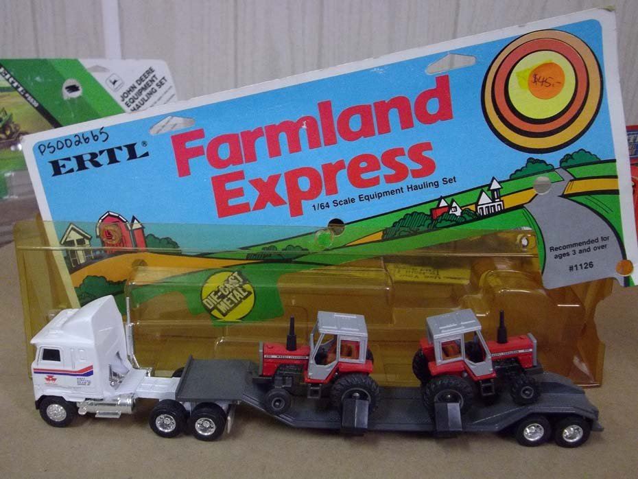 1/64 Stock No. 1126 Frmlnd Exp MF Cab Over Equipment Hauler with MF 699 Tractors