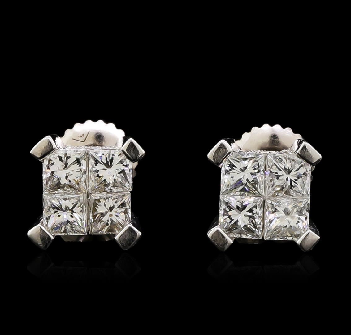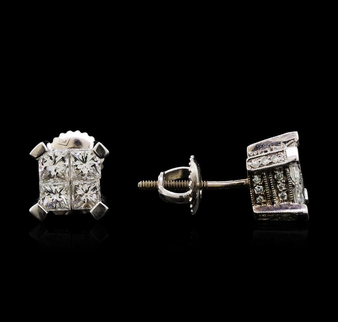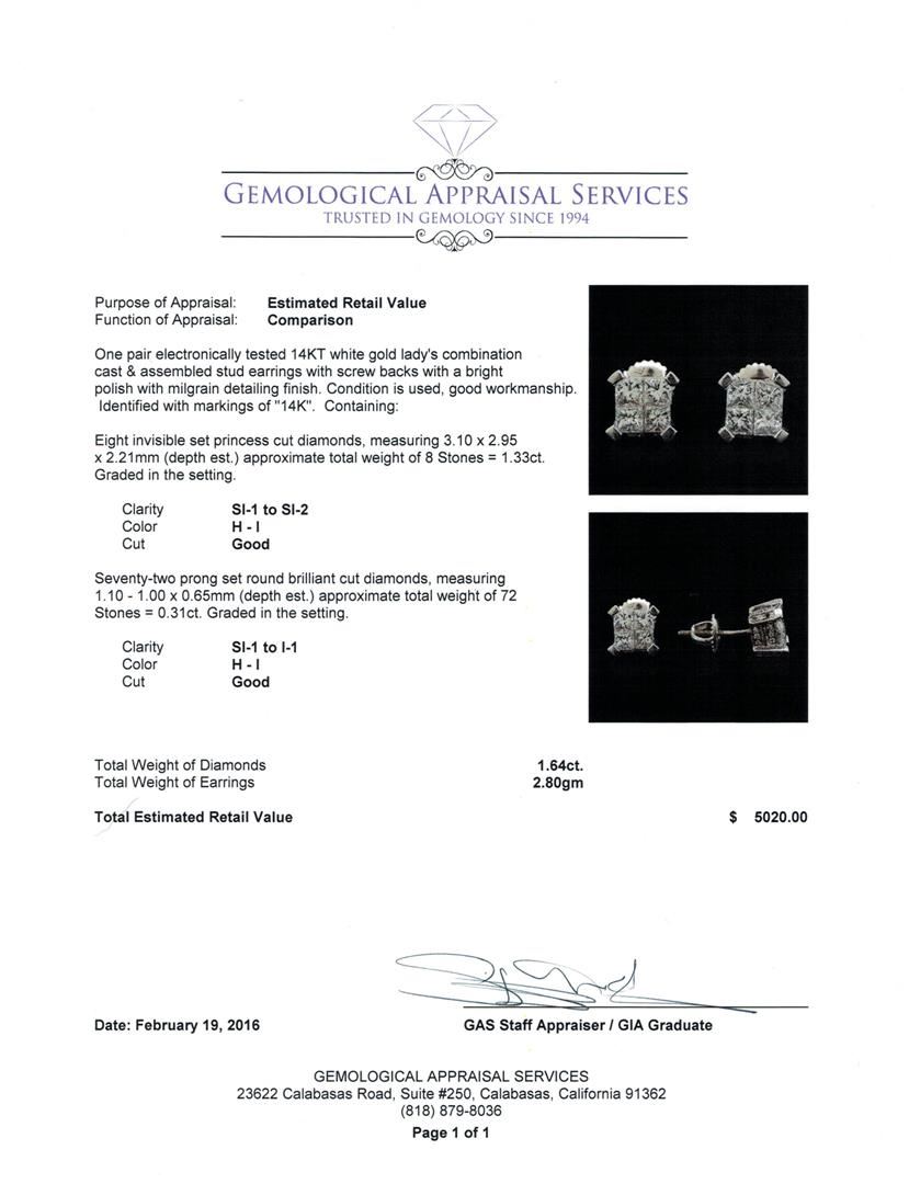 One pair electronically tested 14KT white gold lady's combination cast & assembled stud earrings with screw backs with a bright polish with milgrain detailing finish. Identified with markings of "14K". Condition is used, good workmanship. Containing: Eight invisible set princess cut diamonds, measuring 3.10 x 2.95 x 2.21mm (depth est.) approximate total weight of 8 Stones = 1.33ct. Graded in the setting. Clarity: SI-1 to SI-2. Color: H - I. Cut Good Seventy-Two prong set round brilliant cut diamonds, measuring 1.10 - 1.00 x 0.65mm (depth est.) approximate total weight of 72 Stones = 0.31ct. Graded in the setting. Clarity: SI-1 to I-1. Color: H - I. Cut Good. Total Weight of Diamonds 1.64ct. Total Weight of Earrings 2.80gm. GAS Appraised at $5,020.00.