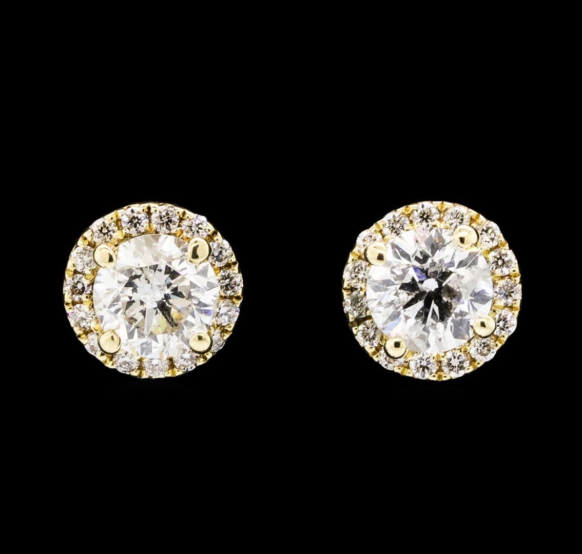 One pair electronically tested 14KT yellow gold lady's combination cast & assembled fashion stud earrings with friction posts with a basket halo with a bright polish finish. Identified with markings of '585'. Condition is new, good workmanship. Containing: Two prong set round brilliant cut diamonds, measuring 5.59 - 5.55 x 3.60mm (depth est.) approximate total weight of 2 Stones = 1.41ct. Graded in the setting. Color H - I Clarity I-1 Cut Good Thirty prong set round brilliant cut diamonds, measuring 1.30 - 1.20 x 0.78mm (depth est.) approximate total weight of 30 Stones = 0.23ct. Graded in the setting. Color H - I Clarity SI-1 to I-1 Cut Good. Total Weight of Diamonds 1.64ct.. Total Weight of Earrings 2.10gm GAS Appraised at $8,990.00.