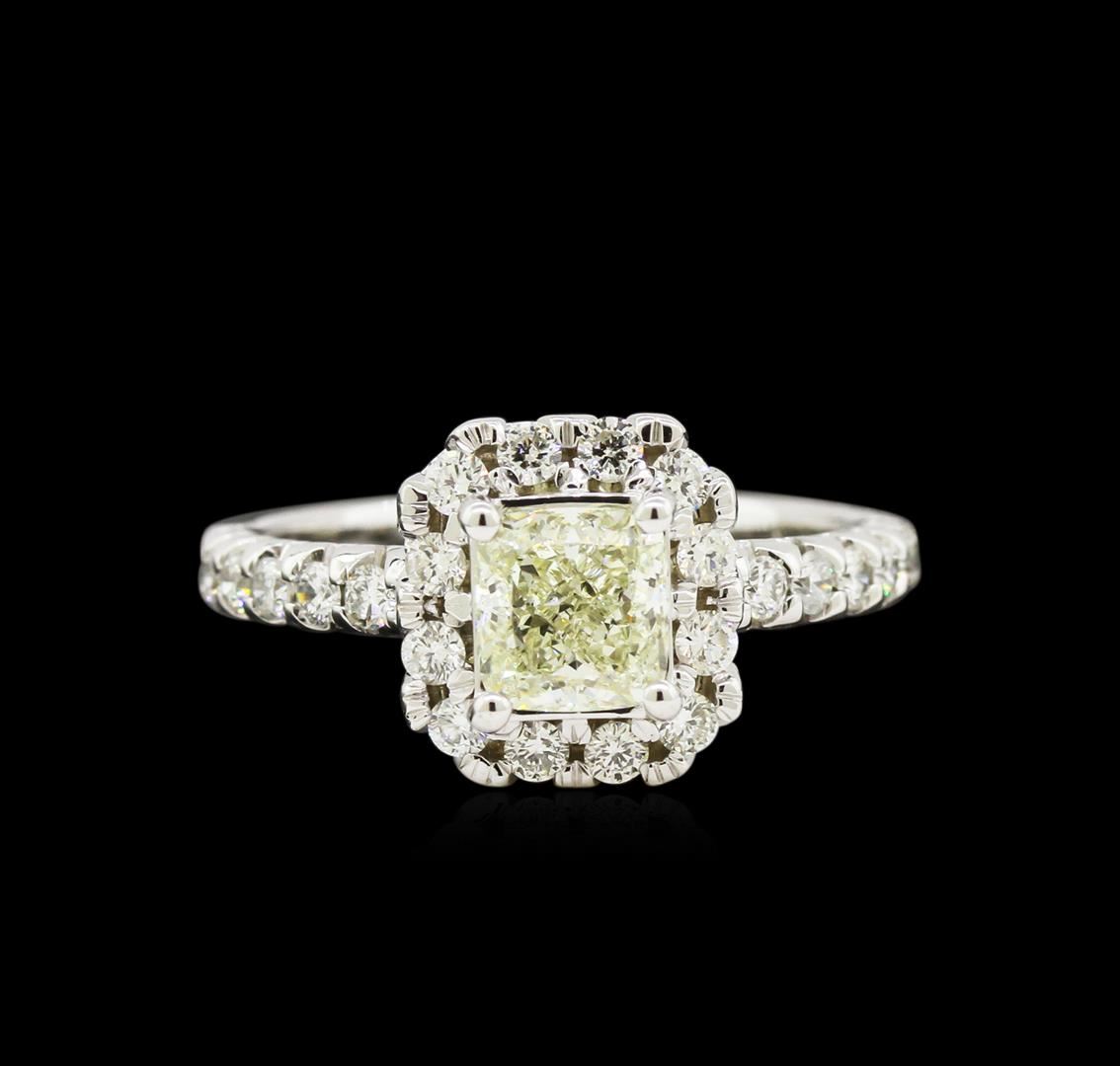 One electronically tested 14KT white gold lady's cast wedding ring with a halo with a bright polish finish. The featured lady's ring has a shank measuring 2.46 millimeters wide. Identified with markings of "14K". Condition is new, good workmanship. Containing: One prong set cushion cut diamond, measuring 5.76 x 5.42 x 3.62mm (depth est.) , 5.00.%. GTCF approximate weight of 1.04ct. Graded in the setting. Clarity: VS-1. Color: O - P. Cut Very Good Twenty-Four prong set round brilliant cut diamonds, measuring 1.90 - 1.80 x 1.17mm (depth est.) approximate total weight of 24 Stones = 0.60ct. Graded in the setting. Clarity: SI-1 to SI-2. Color: H - I. Cut Good. Total Weight of Diamonds 1.64ct. Total Weight of Ring 4.60gm. GAS Appraised at $10,315.00.