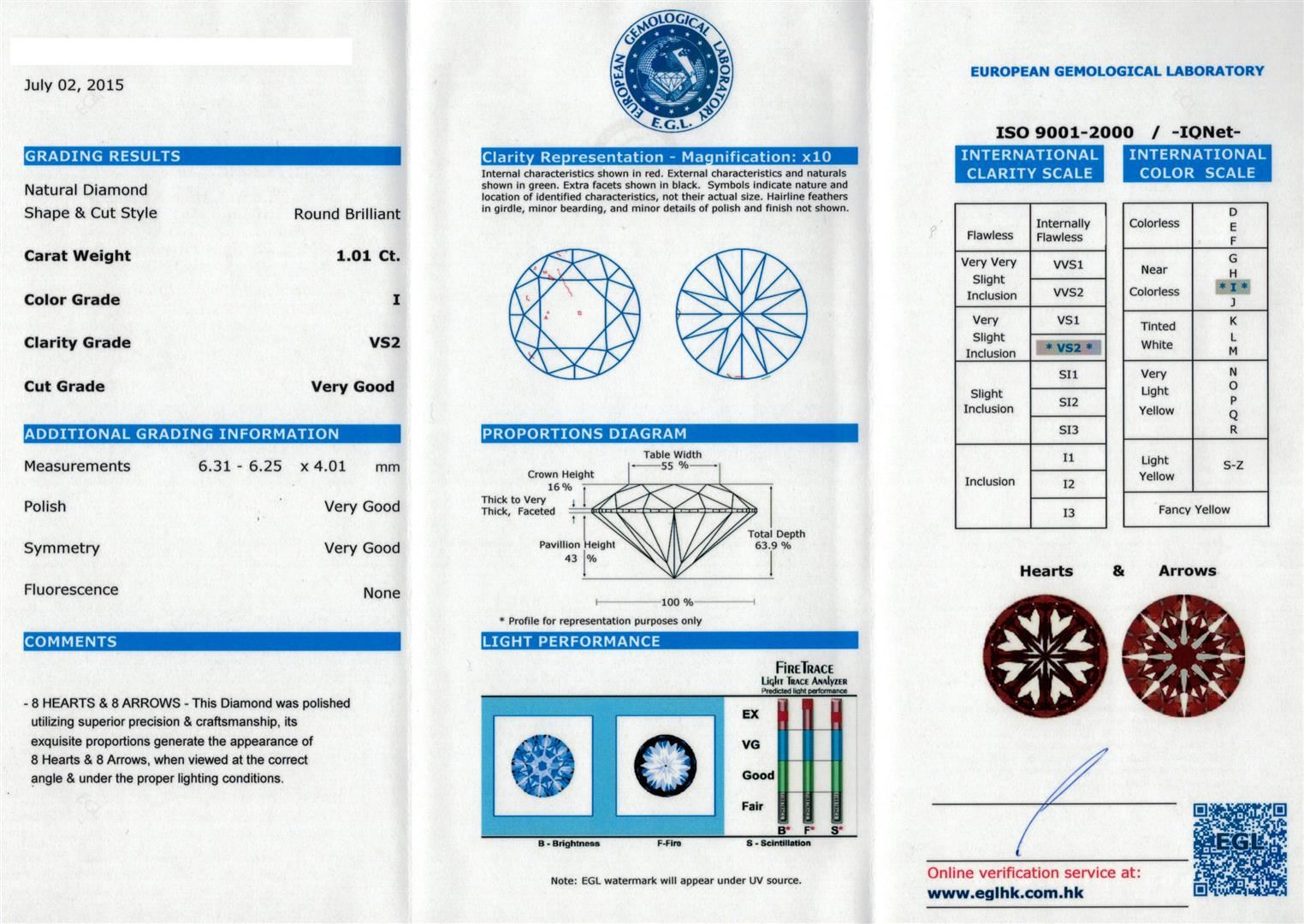 One electronically tested 14KT white gold lady's cast wedding ring with a split shank halo with a bright polish finish. The featured lady's ring has a double shank measuring 4.25 millimeters wide. Identified with markings of "14K". Condition is new, good workmanship. Containing: One prong set round brilliant cut diamond, measuring 6.31 - 6.25 x 4.01mm (depth est.) approximate weight of 1.01ct. EGL Laboratory Report #1501863226. Clarity: VS-2. Color: I. Cut Very Good Twelve prong set round brilliant cut diamonds, measuring 1.90 - 1.85 x 1.17mm (depth est.) approximate total weight of 12 Stones = 0.30ct. Graded in the setting. Clarity: VS-2 to SI-1. Color: H - I. Cut Good Twenty-Four prong set round brilliant cut diamonds, measuring 1.60 - 1.50 x 0.95mm (depth est.) approximate total weight of 24 Stones = 0.33ct. Graded in the setting. Clarity: SI-1 to SI-2. Color: H - I. Cut Good. Total Weight of Diamonds 1.64ct. Total Weight of Ring 7.10gm. GAS Appraised at $16,170.00.