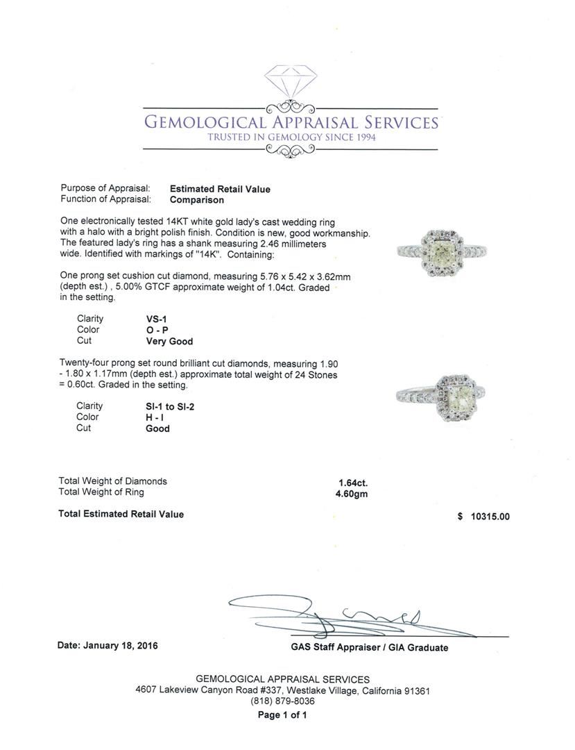 One electronically tested 14KT white gold lady's cast wedding ring with a halo with a bright polish finish. The featured lady's ring has a shank measuring 2.46 millimeters wide. Identified with markings of "14K". Condition is new, good workmanship. Containing: One prong set cushion cut diamond, measuring 5.76 x 5.42 x 3.62mm (depth est.) , 5.00.%. GTCF approximate weight of 1.04ct. Graded in the setting. Clarity: VS-1. Color: O - P. Cut Very Good Twenty-Four prong set round brilliant cut diamonds, measuring 1.90 - 1.80 x 1.17mm (depth est.) approximate total weight of 24 Stones = 0.60ct. Graded in the setting. Clarity: SI-1 to SI-2. Color: H - I. Cut Good. Total Weight of Diamonds 1.64ct. Total Weight of Ring 4.60gm. GAS Appraised at $10,315.00.