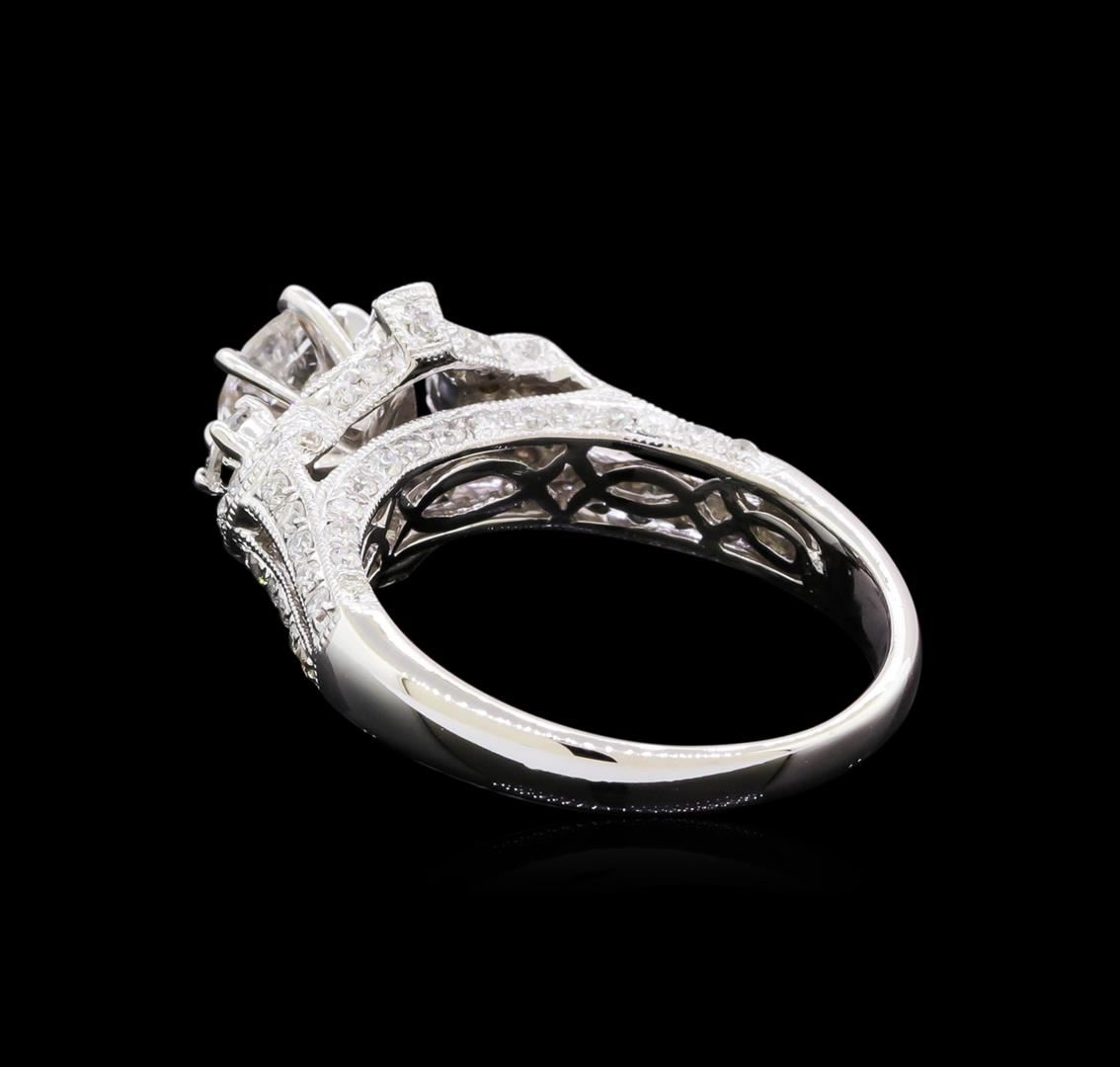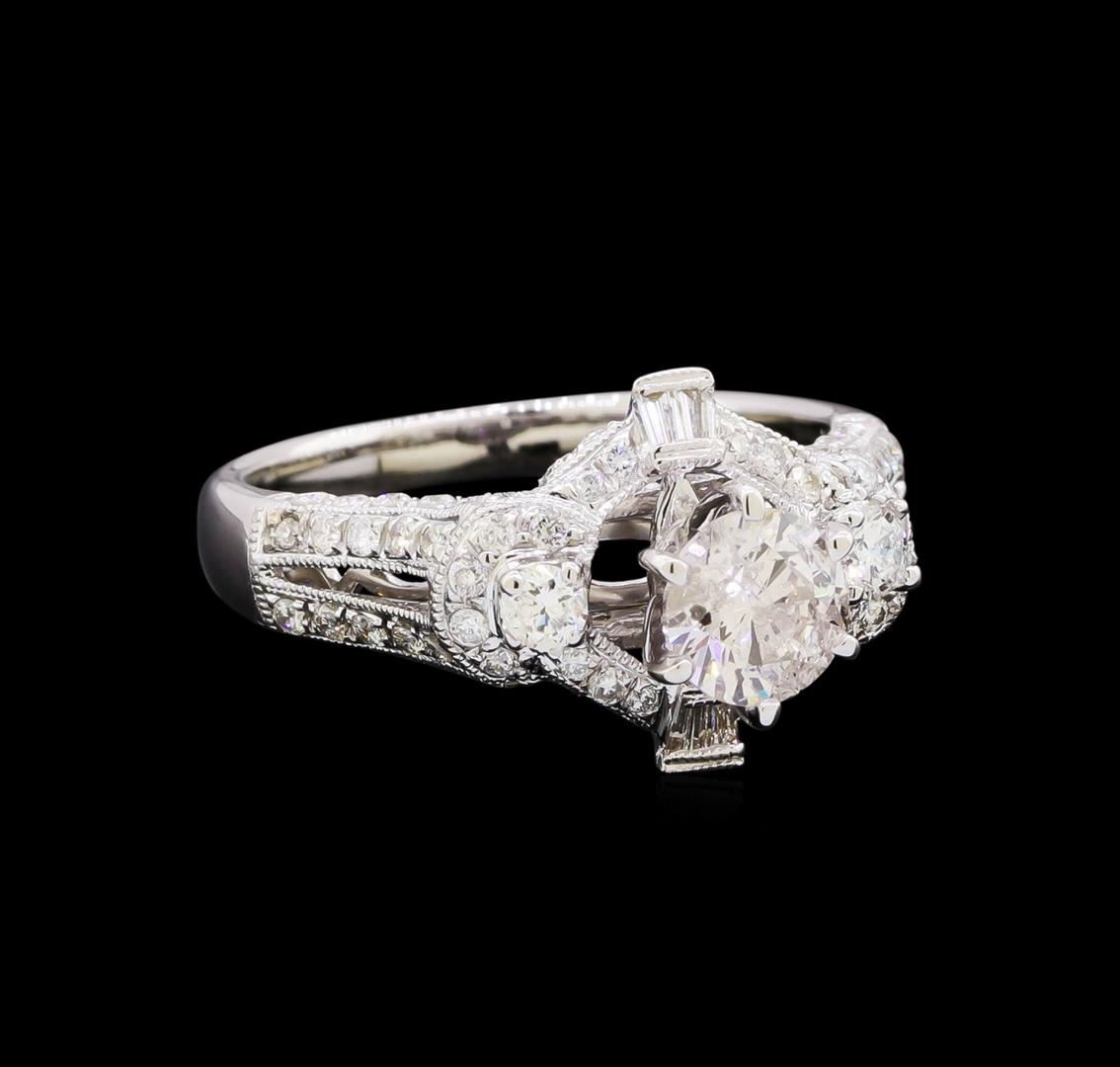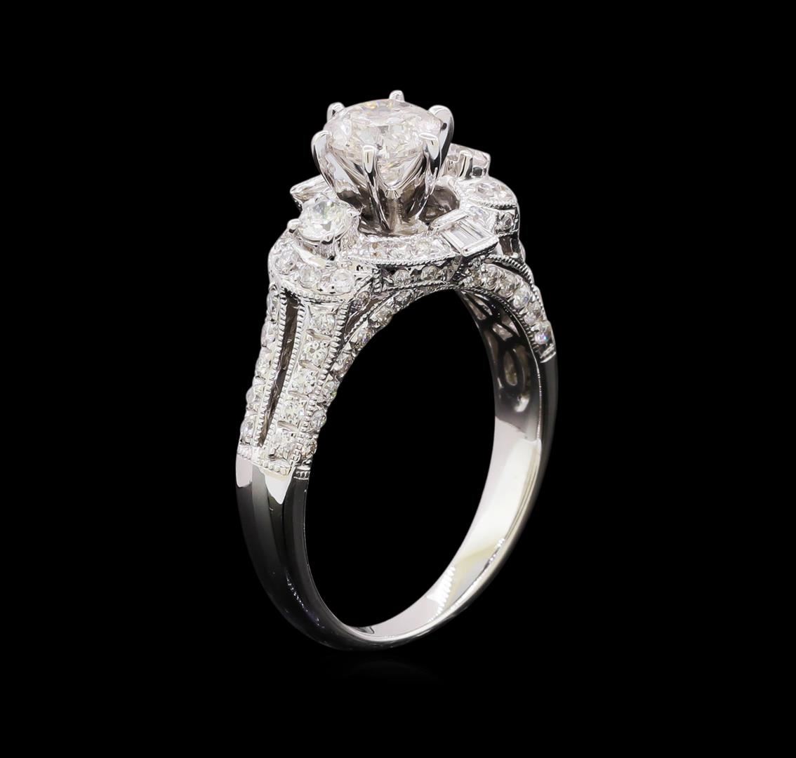 One electronically tested 18KT white gold lady's combination cast & assembled split shank halo wedding ring with a bright polish with milgrain detailing finish. The featured lady's ring has a shank measuring 2.24 millimeters in width. Identified with markings of "18K". Condition is new, good workmanship. Containing: One prong set round brilliant cut diamond, measuring 5.66 - 5.64 x 3.60mm (depth est.) approximate weight of 0.71ct. Graded in the setting. Clarity: I-1. Color: H - I. Cut Good Two prong set round brilliant cut diamonds, measuring 2.67 - 2.50 x 1.63mm (depth est.) approximate total weight of 2 Stones = 0.10ct. Graded in the setting. Clarity: SI-1. Color: H - I. Cut Good Four channel set baguette cut diamonds, measuring from 1.90 x 1.00 x 0.85mm (depth est.) to 2.00 x 1.20 x 1.02mm (depth est.) approximate total weight of 4 Stones = 0.08ct. Graded in the setting. Clarity: VS-2 to SI-1. Color: H - I. Cut Very Good Eighty-Four prong set round brilliant cut diamonds, measuring 1.40 - 1.30 x 0.81mm (depth est.) approximate total weight of 84 Stones = 0.75ct. Graded in the setting. Clarity: VS-2 to SI-1. Color: H - I. Cut Good. Total Weight of Diamonds 1.64ct. Total Weight of Wedding Ring 5.40gm. GAS Appraised at $7,335.00.