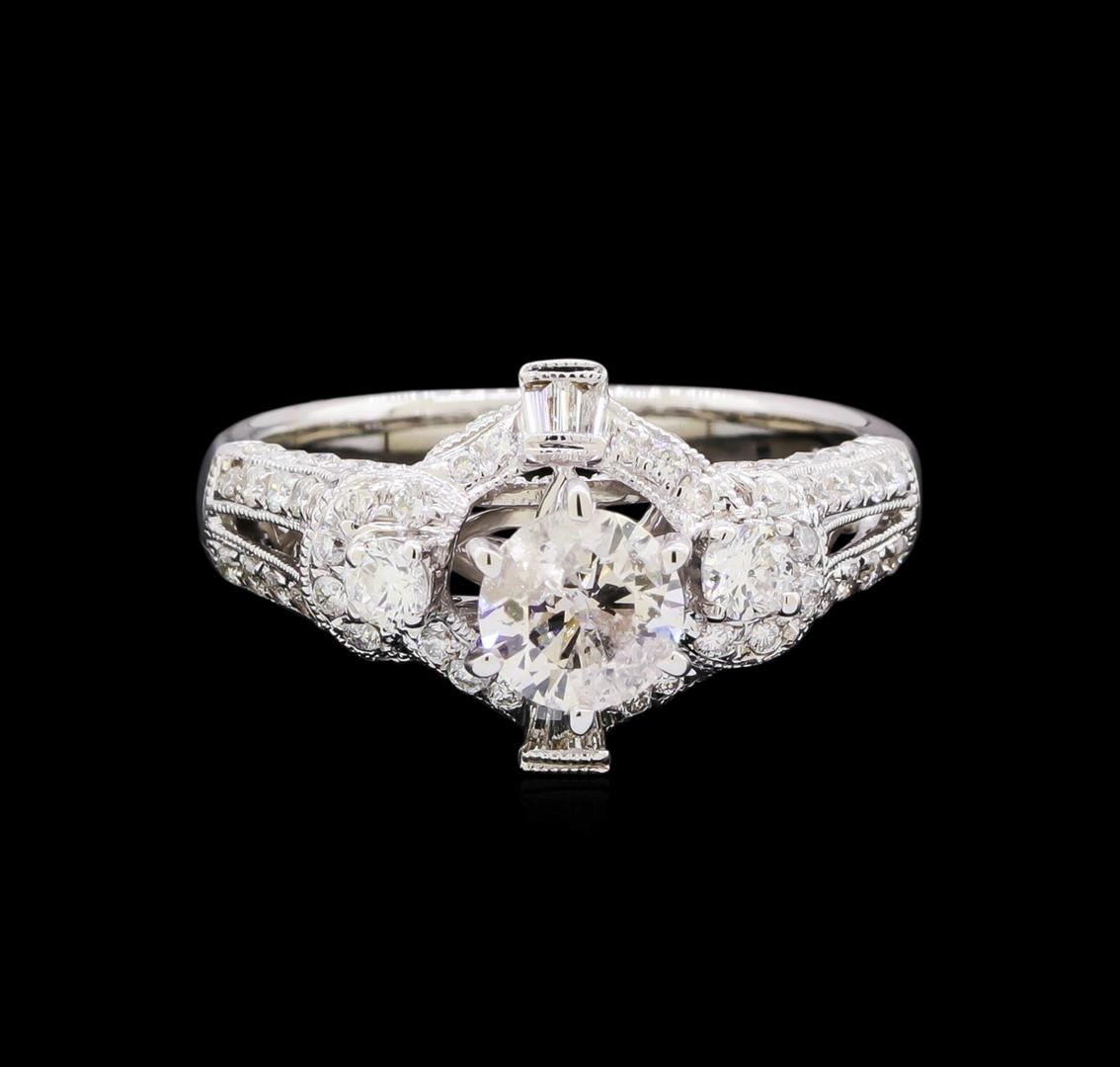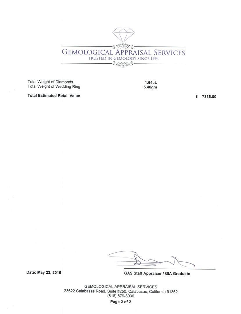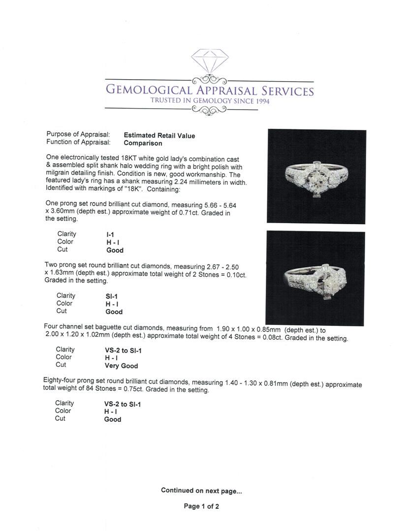 One electronically tested 18KT white gold lady's combination cast & assembled split shank halo wedding ring with a bright polish with milgrain detailing finish. The featured lady's ring has a shank measuring 2.24 millimeters in width. Identified with markings of "18K". Condition is new, good workmanship. Containing: One prong set round brilliant cut diamond, measuring 5.66 - 5.64 x 3.60mm (depth est.) approximate weight of 0.71ct. Graded in the setting. Clarity: I-1. Color: H - I. Cut Good Two prong set round brilliant cut diamonds, measuring 2.67 - 2.50 x 1.63mm (depth est.) approximate total weight of 2 Stones = 0.10ct. Graded in the setting. Clarity: SI-1. Color: H - I. Cut Good Four channel set baguette cut diamonds, measuring from 1.90 x 1.00 x 0.85mm (depth est.) to 2.00 x 1.20 x 1.02mm (depth est.) approximate total weight of 4 Stones = 0.08ct. Graded in the setting. Clarity: VS-2 to SI-1. Color: H - I. Cut Very Good Eighty-Four prong set round brilliant cut diamonds, measuring 1.40 - 1.30 x 0.81mm (depth est.) approximate total weight of 84 Stones = 0.75ct. Graded in the setting. Clarity: VS-2 to SI-1. Color: H - I. Cut Good. Total Weight of Diamonds 1.64ct. Total Weight of Wedding Ring 5.40gm. GAS Appraised at $7,335.00.