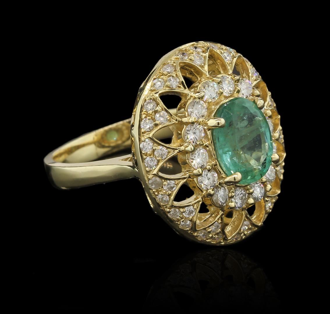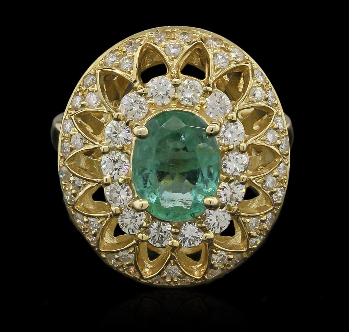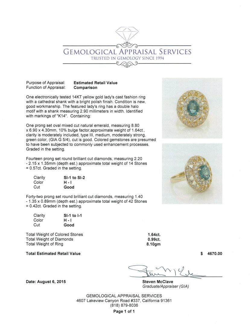One electronically tested 14KT yellow gold lady's cast fashion ring with a cathedral shank with a bright polish finish. The featured lady's ring has a double halo motif with a shank measuring 2.90 millimeters in width. Identified with markings of "K14". Condition is new, good workmanship. Containing: One prong set oval mixed cut natural emerald, measuring 8.80 x 6.90 x 4.30mm, 10% bulge factor, approximate weight of 1.64ct., clarity is moderately included, type III, medium, moderately strong, green color, (GIA G 5/4), cut is good. Colored gemstones are presumed to have been subjected to commonly used enhancement processes. Graded in the setting. Fourteen prong set round brilliant cut diamonds, measuring 2.20 - 2.15 x 1.35mm (depth est.) approximate total weight of 14 Stones = 0.57ct. Graded in the setting. Clarity: SI-1 to SI-2. Color: H - I. Cut Good Forty-Two prong set round brilliant cut diamonds, measuring 1.40 - 1.35 x 0.89mm (depth est.) approximate total weight of 42 Stones = 0.42ct. Graded in the setting. Clarity: SI-1 to I-1. Color: H - I. Cut Good. Total Weight of Colored Stones 1.64ct. Total Weight of Diamonds 0.99ct. Total Weight of Ring 8.10gm. GAS Appraised at $4,670.00.