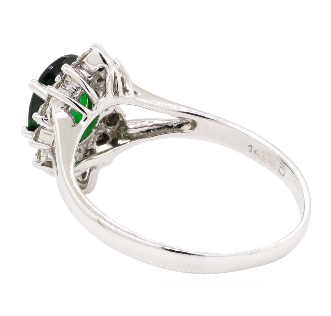 One electronically tested 14KT white gold lady's cast fashion ring with a split shank basket halo with a bright polish finish. The featured lady's ring has a shank measuring 1.80 millimeters wide. Identified with markings of '14K'. Condition is new, good workmanship. Containing: One prong set oval modified mixed cut natural tsavorite garnet, measuring 7.97 x 5.77 x 3.10mm, (depth est.) 10%. bulge factor, approximate weight of 1.29ct., clarity is eye clean, medium dark, strong, green color, (GIA G 6/5), cut is good. Transmitting light with no distortion, transparent. Colored gemstones are presumed to have been subjected to commonly used enhancement processes. Graded in the setting. Fourteen prong set round brilliant cut diamonds, measuring 1.90 - 1.80 x 1.15mm (depth est.) approximate total weight of 14 Stones = 0.35ct. Graded in the setting. Color H - I Clarity SI-1 to SI-2 Cut Good. Total Weight of Colored Stones 1.29ct.. Total Weight of Diamonds 0.35ct.. Total Weight of Ring 2.70gm GAS Appraised at $4795.00. GAS Appraised at $4,795.00.
