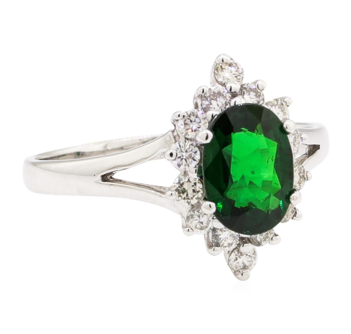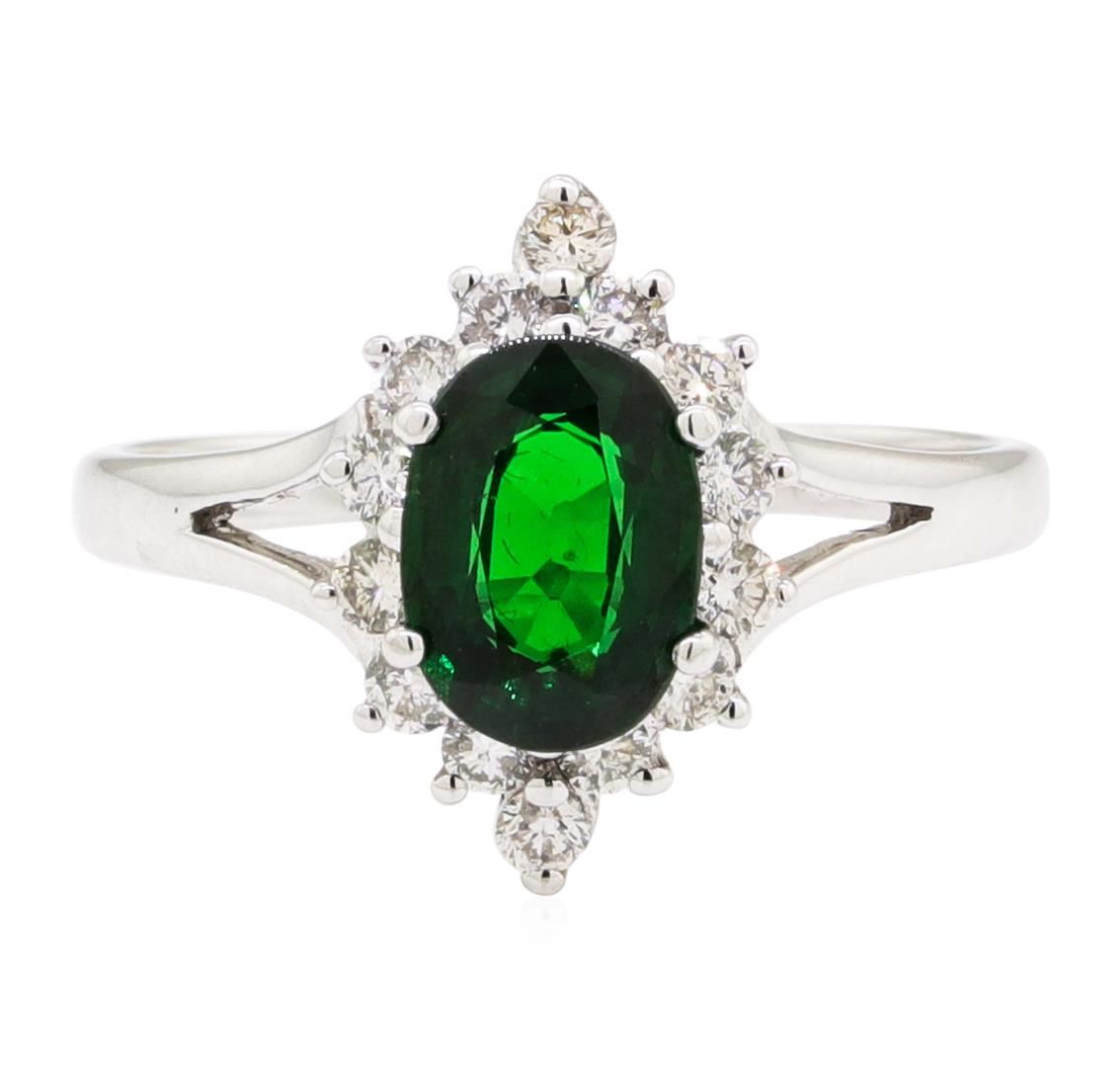 One electronically tested 14KT white gold lady's cast fashion ring with a split shank basket halo with a bright polish finish. The featured lady's ring has a shank measuring 1.80 millimeters wide. Identified with markings of '14K'. Condition is new, good workmanship. Containing: One prong set oval modified mixed cut natural tsavorite garnet, measuring 7.97 x 5.77 x 3.10mm, (depth est.) 10%. bulge factor, approximate weight of 1.29ct., clarity is eye clean, medium dark, strong, green color, (GIA G 6/5), cut is good. Transmitting light with no distortion, transparent. Colored gemstones are presumed to have been subjected to commonly used enhancement processes. Graded in the setting. Fourteen prong set round brilliant cut diamonds, measuring 1.90 - 1.80 x 1.15mm (depth est.) approximate total weight of 14 Stones = 0.35ct. Graded in the setting. Color H - I Clarity SI-1 to SI-2 Cut Good. Total Weight of Colored Stones 1.29ct.. Total Weight of Diamonds 0.35ct.. Total Weight of Ring 2.70gm GAS Appraised at $4795.00. GAS Appraised at $4,795.00.