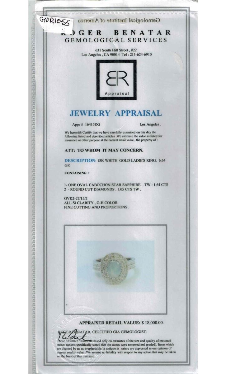 18K WHITE GOLD NATURAL STAR SAPPHIRE RING:6.64 GRAMS/DIAMOND:1.05CT/STAR SAPPHIRE:1.64CT/#GVR1055