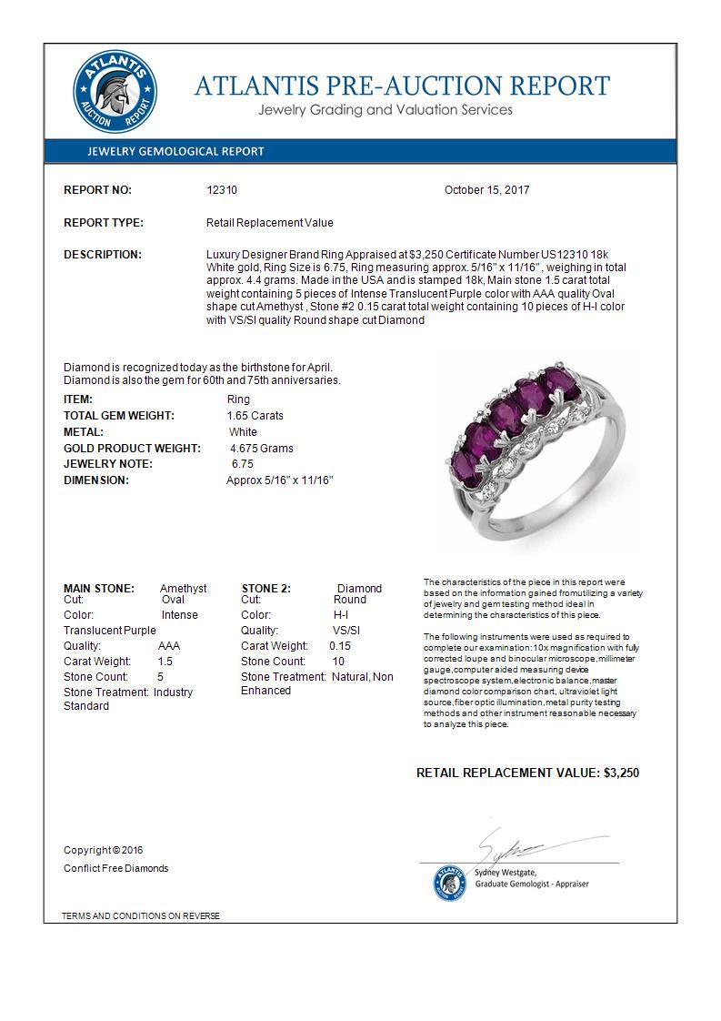 REF-45A5X -12310 ---- 1.65 CTW Amethyst & Diamond Ring 18K White Gold ---- Luxury Designer Brand Ring Appraised at $3,250 Certificate Number US12310 18k White gold, Ring Size is 6.75, Ring measuring approx. 5/16" x 11/16" , weighing in total approx. 4.4 grams. Made in the USA and is stamped 18k, Main stone 1.5 carat total weight containing 5 pieces of Intense Translucent Purple color with AAA quality Oval shape cut Amethyst , Stone #2 0.15 carat total weight containing 10 pieces of H-I color with VS/SI quality Round shape cut Diamond
