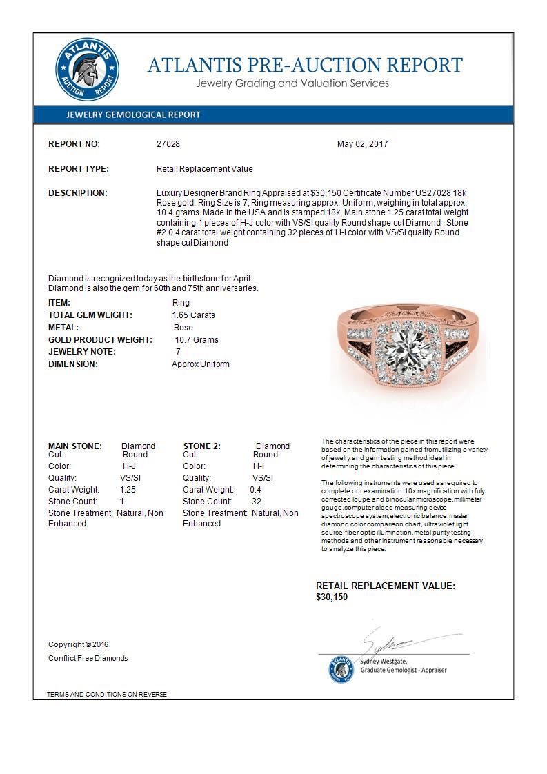 1.65 CTW Certified VS/SI Diamond Solitaire Halo Ring 18K Rose Gold ---- Luxury Designer Brand Ring Appraised Retail Price at $30,150 ---- SKU Number US27028 18k Rose gold Ring Size is 7, Ring measuring approx. Uniform, weighing in total approx. 10.4 grams. Made in the USA and is stamped 18k, Main stone 1.25 carat total weight containing 1 pieces of H-J color with VS/SI quality Round shape cut Diamond , Stone #2 0.4 carat total weight containing 32 pieces of H-I color with VS/SI quality Round shape cut