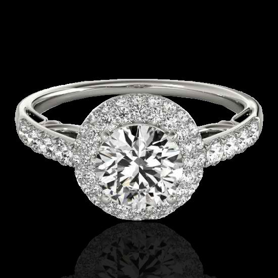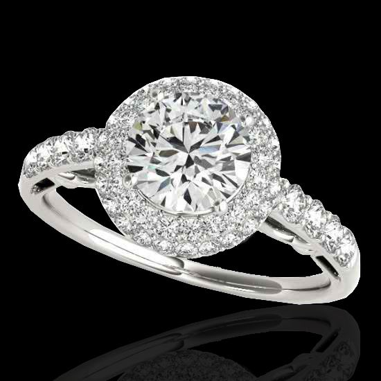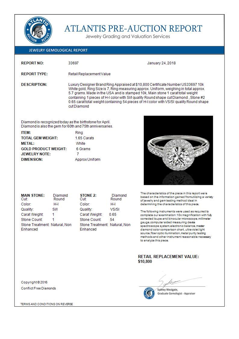 REF-178W2F -33697 ---- 1.65 CTW H-SI/I Certified Diamond Solitaire Halo Ring 10K White Gold ---- Luxury Designer Brand Ring Appraised at $10,800 Certificate Number US33697 10k White gold, Ring Size is 7, Ring measuring approx. Uniform, weighing in total approx. 5.7 grams. Made in the USA and is stamped 10k, Main stone 1 carat total weight containing 1 pieces of H-I color with SI/I quality Round shape cut Diamond , Stone #2 0.65 carat total weight containing 54 pieces of H-I color with VS/SI quality Round shape cut Diamond