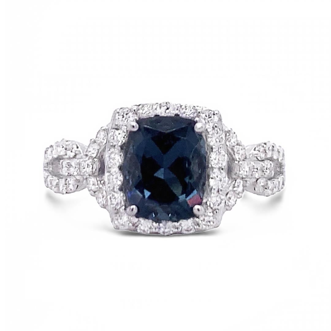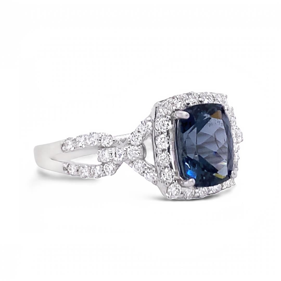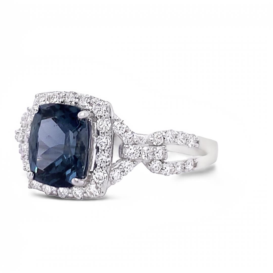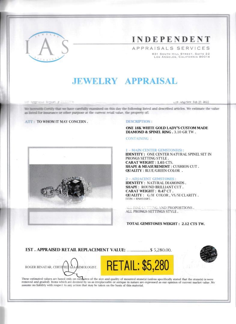 DESCRIPTION: ONE 18K WHITE GOLD LADY'S CUSTOM MADE DIAMOND AND SPINEL RING. 3.10 GR TW. #1 - MAIN CENTER GEMSTONE(S):# IDENTITY: ONE CENTER NATURAL SPINEL SET IN PRONGS SETTING STYLE CARAT WEIGHT: 1.65 CTS SHAPE AND MEASUREMEMT: CUSHION CUT QUALITY: BLUE/GREEN COLOR #2 - ADJACENT GEMSTONES:# IDENTITY: NATURAL DIAMONDS SHAPE: ROUND BRILLIANT CUT CARAT WEIGHT: 0.47 CT QUALITY: G/H COLOR, VS/SI CLARITY TOTAL GEMSTONES WEIGHT: 2.12 CTS TW.