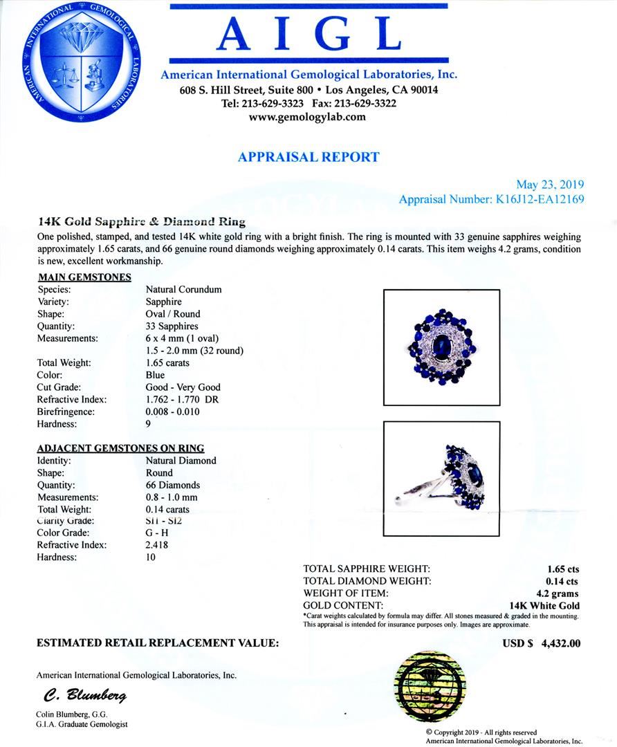 14K Gold Sapphire Diamond Ring One polished, stamped, and tested 14K white gold ring with a bright finish. The ring is mounted with 33 genuine sapphires weighing approximately 1.65 carats, and 66 genuine round diamonds weighing approximately 0.14 carats. This item weighs 4.2 grams, condition is new, excellent workmanship. MAIN GEMSTONES Species: Natural Corundum Variety: Sapphire Shape: Oval / Round Quantity: 33 Sapphires Measurements: 6 x 4 mm (1 oval) 1.5 - 2.0 mm (32 round) Total Weight: 1.65 carats Color: Blue Cut Grade: Good - Very Good Refractive Index: 1.762 - 1.770 DR Birefringence: 0.008 - 0.010 Hardness: 9 ADJACENT GEMSTONES ON RING Identity: Natural Diamond Shape: Round Quantity: 66 Diamonds Measurements: 0.8 - 1.0 mm Total Weight: 0.14 carats Clarity Grade: SI1 - SI2 Color Grade: G - H Refractive Index: 2.418 Hardness: 10 TOTAL SAPPHIRE WEIGHT: 1.65ctw TOTAL DIAMOND WEIGHT: 0.14ctw WEIGHT OF ITEM: 4.2 grams GOLD CONTENT: 14K White Gold