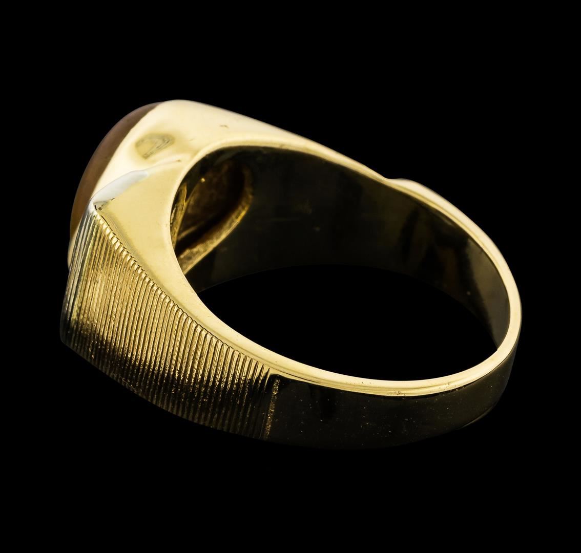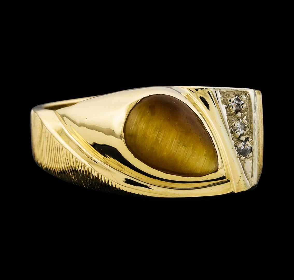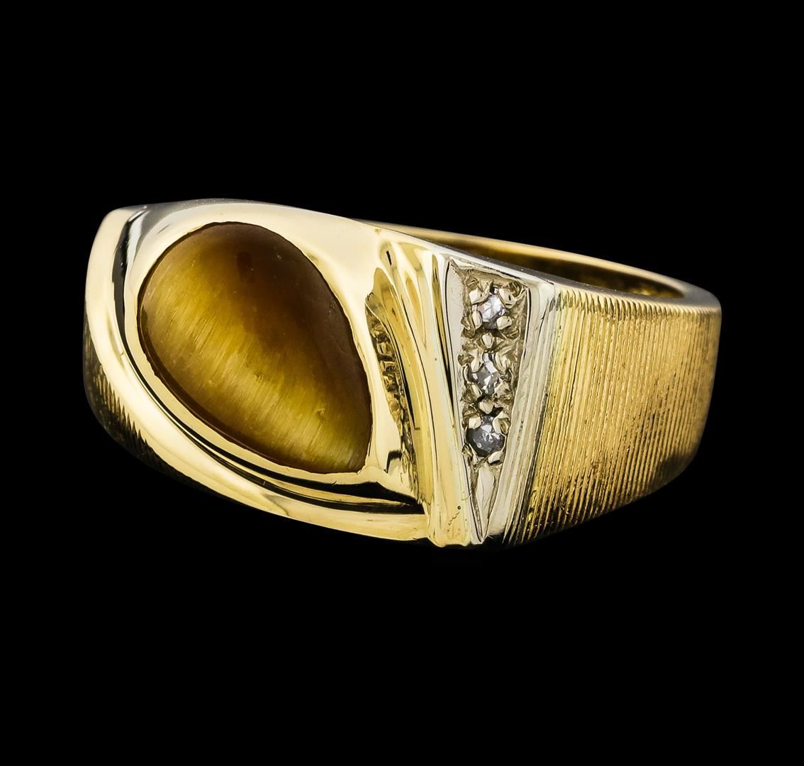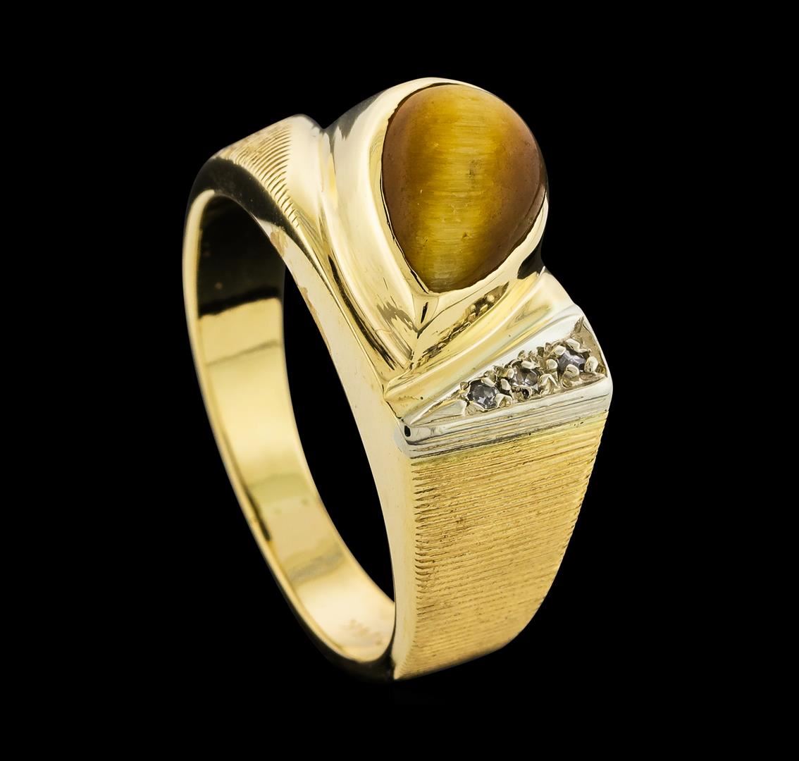 One Cats Eye and Diamond Ring featuring: 14KT Yellow Gold with a total weight of 8.40 grams, Cat Eye stone with a total weight of 1.65ct, and side diamonds with a total weight of 0.10ctw.