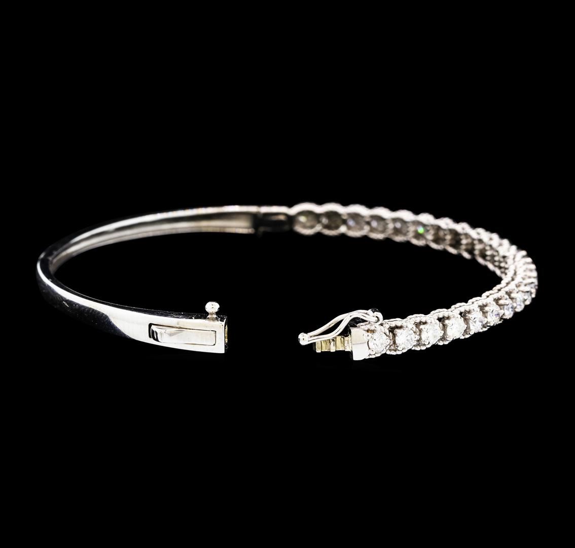 One electronically tested 14KT white gold lady's combination cast & assembled fashion bangle bracelet with a tongue clasp with foldover safety with a bright polish with milgrain detailing finish. The featured lady's bracelet measures approximately 7 inches in length. Identified with markings of 'K14'. Condition is new, good workmanship. Containing: Twenty-Five prong set round brilliant cut diamonds, measuring 2.60 - 2.55 x 1.60mm (depth est.) approximate total weight of 25 Stones = 1.65ct. Graded in the setting. Clarity SI-1 to I-1. Color: G - H Cut Good. Total Weight of Diamonds 1.65ct.. Total Weight of Bangle Bracelet 10.60gm. GAS Appraised at $5,430.00.