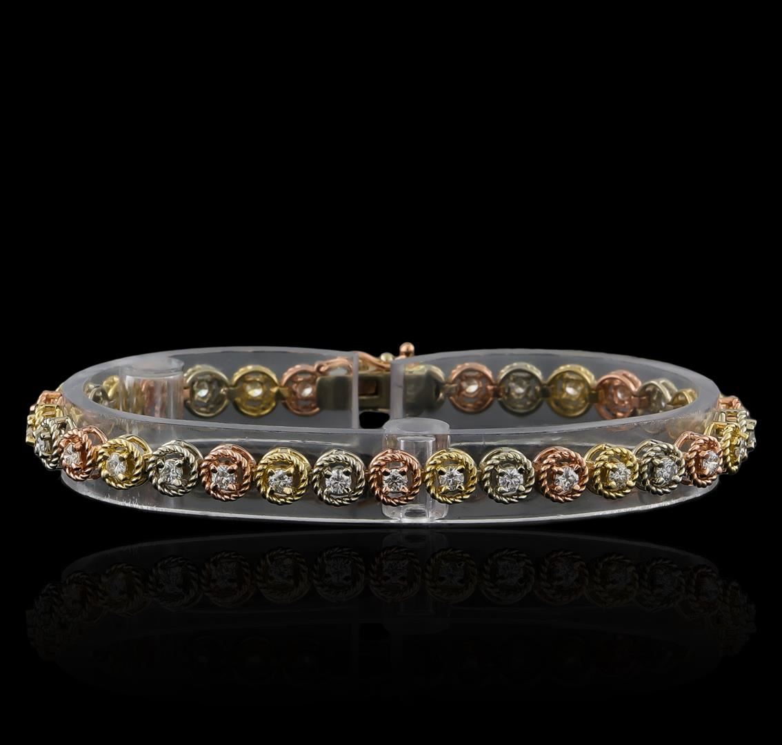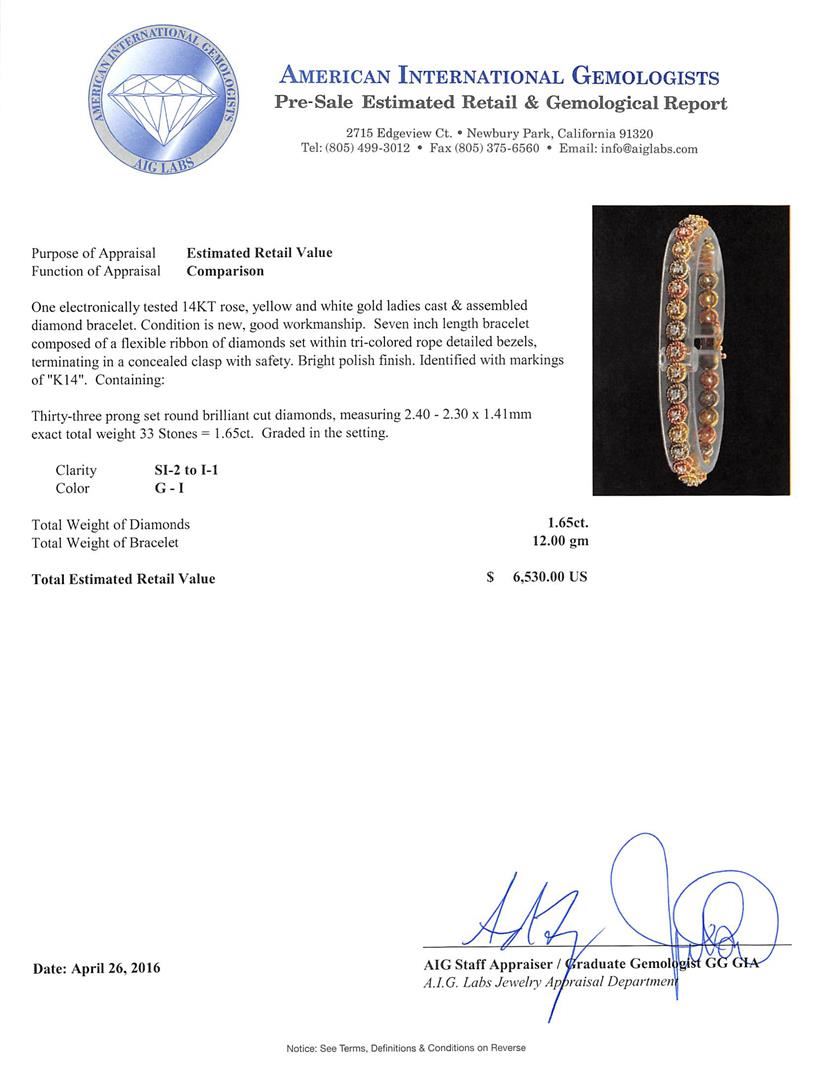 One electronically tested 14KT rose, yellow and white gold ladies cast & assembled diamond bracelet. Seven inch length bracelet composed of a flexible ribbon of diamonds set within tri-colored rope detailed bezels, terminating in a concealed clasp with safety. Bright polish finish. Identified with markings of "K14". Condition is new, good workmanship. Containing: Thirty-Three prong set round brilliant cut diamonds, measuring 2.40 - 2.30 x 1.41mm exact total weight 33 Stones = 1.65ct. Graded in the setting. Clarity: SI-2 to I-1. Color: G - I. Total Weight of Diamonds 1.65ct. Total Weight of Bracelet 12.00gm. AIG Appraised at $6,530.00.