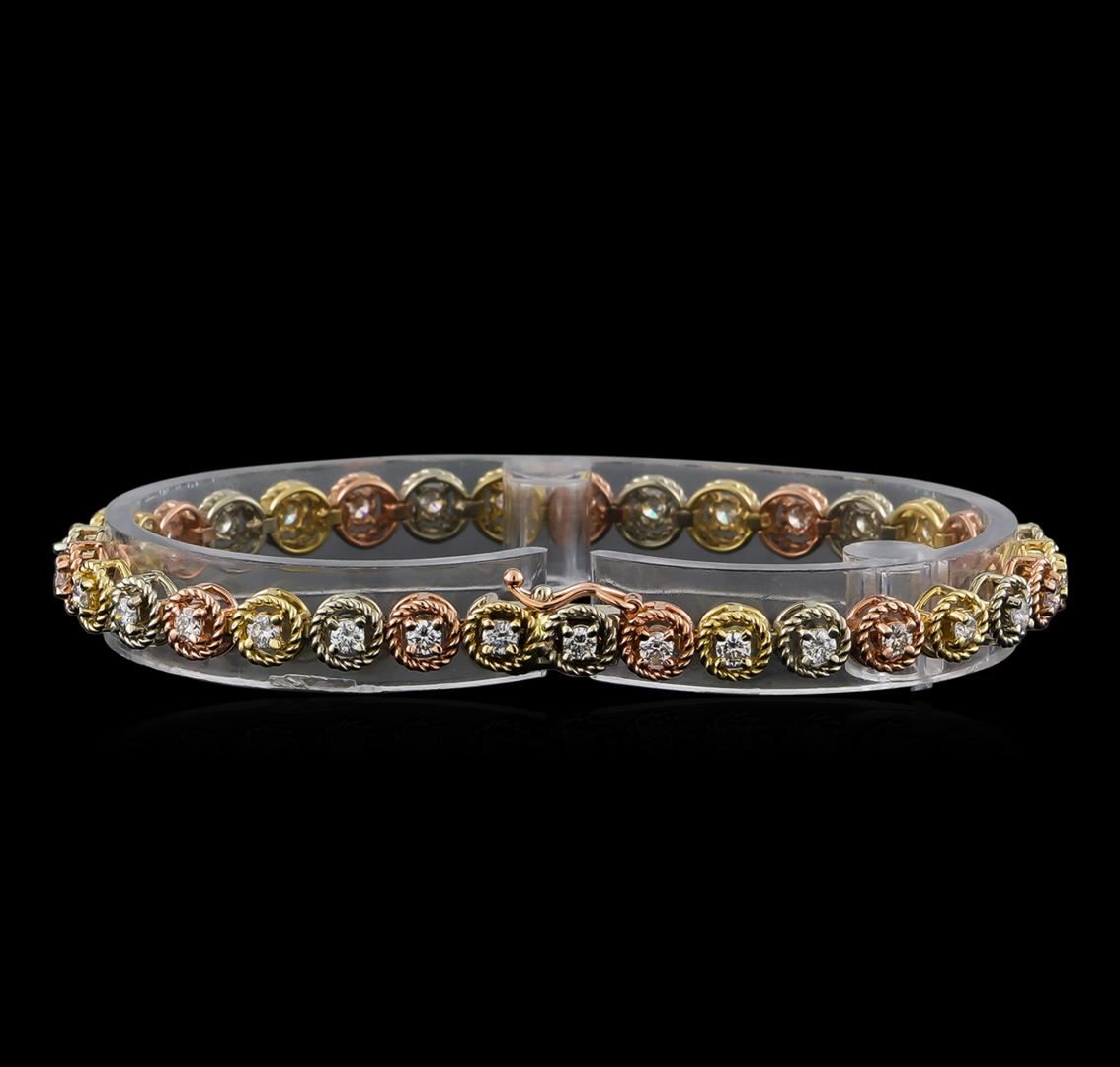 One electronically tested 14KT rose, yellow and white gold ladies cast & assembled diamond bracelet. Seven inch length bracelet composed of a flexible ribbon of diamonds set within tri-colored rope detailed bezels, terminating in a concealed clasp with safety. Bright polish finish. Identified with markings of "K14". Condition is new, good workmanship. Containing: Thirty-Three prong set round brilliant cut diamonds, measuring 2.40 - 2.30 x 1.41mm exact total weight 33 Stones = 1.65ct. Graded in the setting. Clarity: SI-2 to I-1. Color: G - I. Total Weight of Diamonds 1.65ct. Total Weight of Bracelet 12.00gm. AIG Appraised at $6,530.00.